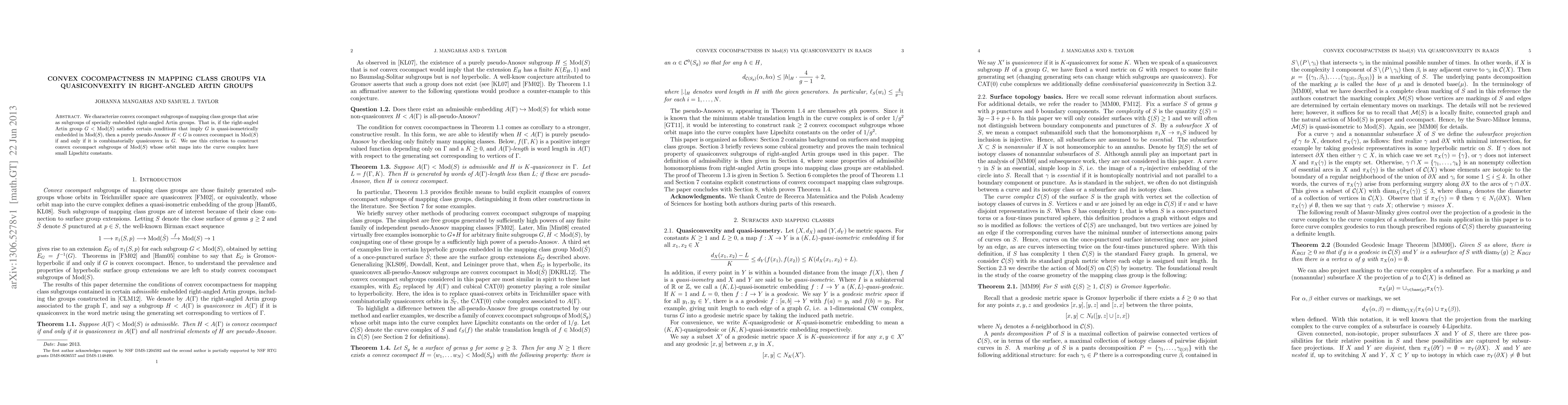 Summary: This paper characterizes convex cocompact subgroups in mapping class groups by linking their properties to quasiconvexity in specially embedded right-angled Artin groups, providing a criterion for constructing such subgroups with controlled orbit maps in the curve complex.