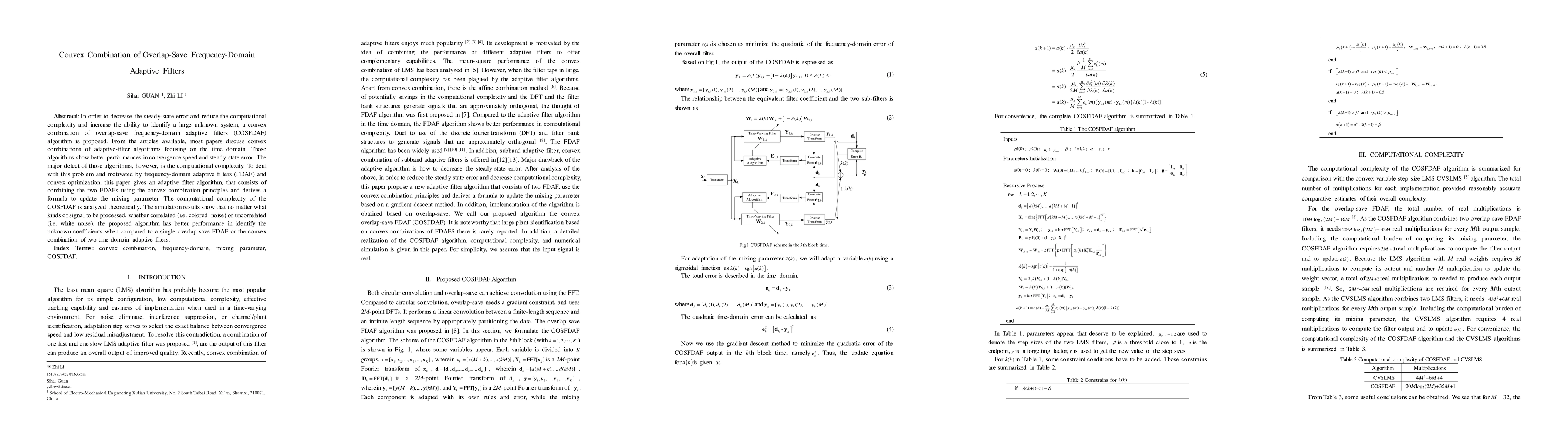 In order to decrease the steady-state error and reduce the computational complexity and increase the ability to identify a large unknown system, a convex combination of overlap-save frequency-domain adaptive filters (COSFDAF) algorithm is proposed. From the articles available, most papers discuss convex combinations of adaptive-filter algorithms focusing on the time domain. Those algorithms show better performances in convergence speed and steady-state error. The major defect of those algorithms, however, is the computational complexity. To deal with this problem and motivated by frequency-domain adaptive filters (FDAF) and convex optimization, this paper gives an adaptive filter algorithm, that consists of combining the two FDAFs using the convex combination principles and derives a formula to update the mixing parameter. The computational complexity of the COSFDAF is analyzed theoretically. The simulation results show that no matter what kinds of signal to be processed, whether correlated (i.e. colored noise) or uncorrelated (i.e. white noise), the proposed algorithm has better performance in identify the unknown coefficients when compared to a single overlap-save FDAF or the convex combination of two time-domain adaptive filters.
