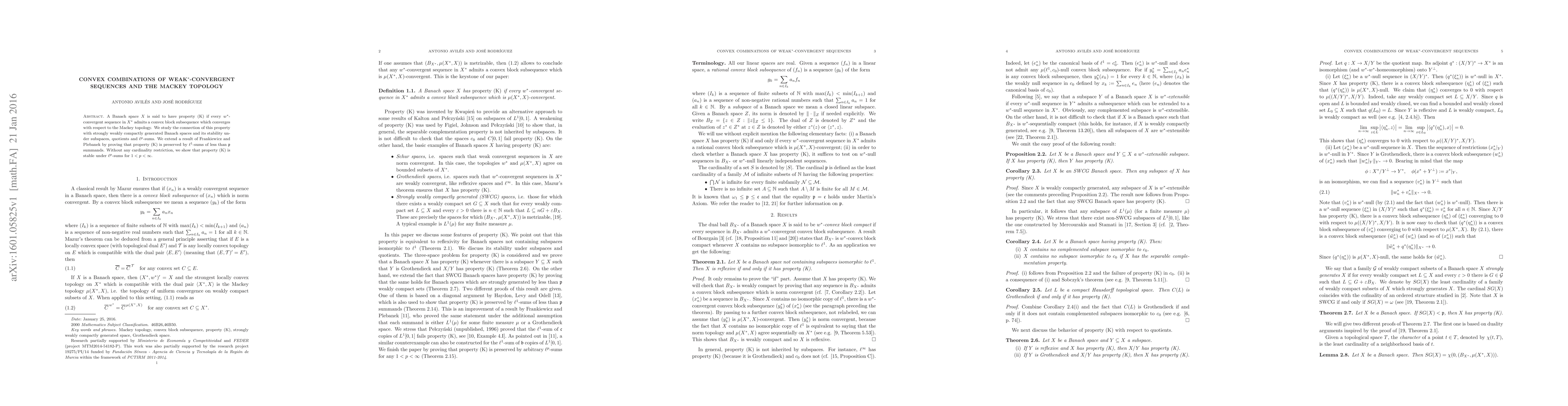 This paper investigates Banach spaces with property (K), where every $w^*$-convergent sequence in $X^*$ has a convex block subsequence converging in the Mackey topology. It explores the relationship between this property and strongly weakly compactly generated spaces, and proves stability under various operations including $\ell^1$-sums with cardinality restrictions and $\ell^p$-sums for $1 < p < \infty$.