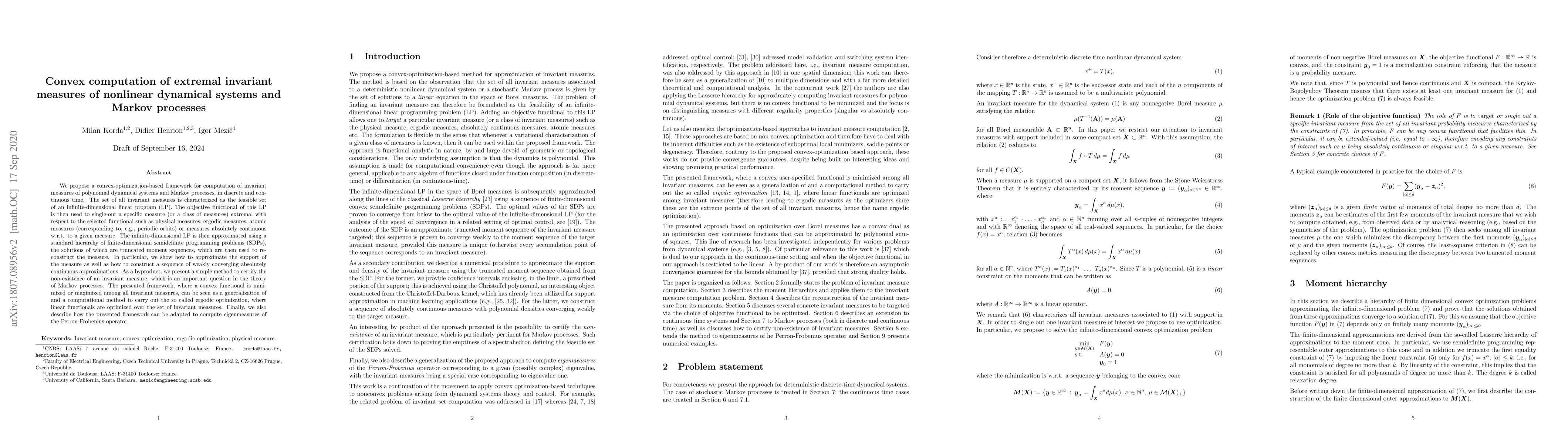 We propose a convex-optimization-based framework for computation of invariant measures of polynomial dynamical systems and Markov processes, in discrete and continuous time. The set of all invariant measures is characterized as the feasible set of an infinite-dimensional linear program (LP). The objective functional of this LP is then used to single-out a specific measure (or a class of measures) extremal with respect to the selected functional such as physical measures, ergodic measures, atomic measures (corresponding to, e.g., periodic orbits) or measures absolutely continuous w.r.t. to a given measure. The infinite-dimensional LP is then approximated using a standard hierarchy of finite-dimensional semidefinite programming problems (SDPs), the solutions of which are truncated moment sequences, which are then used to reconstruct the measure. In particular, we show how to approximate the support of the measure as well as how to construct a sequence of weakly converging absolutely continuous approximations. The presented framework, where a convex functional is minimized or maximized among all invariant measures, can be seen as a generalization of and a computational method to carry out the so called ergodic optimization, where linear functionals are optimized over the set of invariant measures. Finally, we also describe how the presented framework can be adapted to compute eigenmeasures of the Perron-Frobenius operator.
