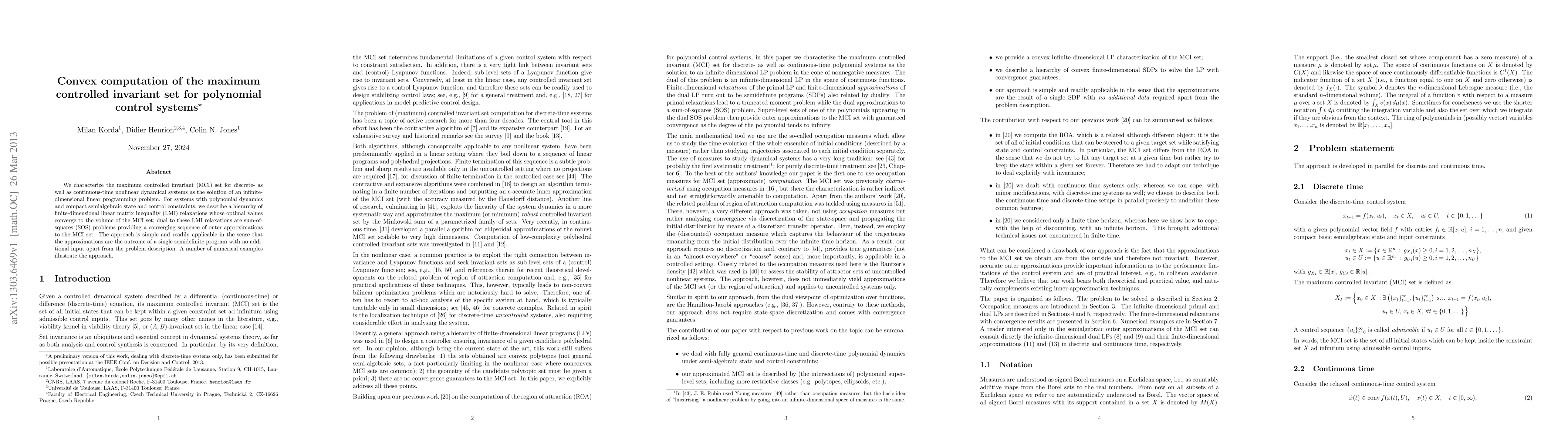 We characterize the maximum controlled invariant (MCI) set for discrete- as well as continuous-time nonlinear dynamical systems as the solution of an infinite-dimensional linear programming problem. For systems with polynomial dynamics and compact semialgebraic state and control constraints, we describe a hierarchy of finite-dimensional linear matrix inequality (LMI) relaxations whose optimal values converge to the volume of the MCI set; dual to these LMI relaxations are sum-of-squares (SOS) problems providing a converging sequence of outer approximations to the MCI set. The approach is simple and readily applicable in the sense that the approximations are the outcome of a single semidefinite program with no additional input apart from the problem description. A number of numerical examples illustrate the approach.