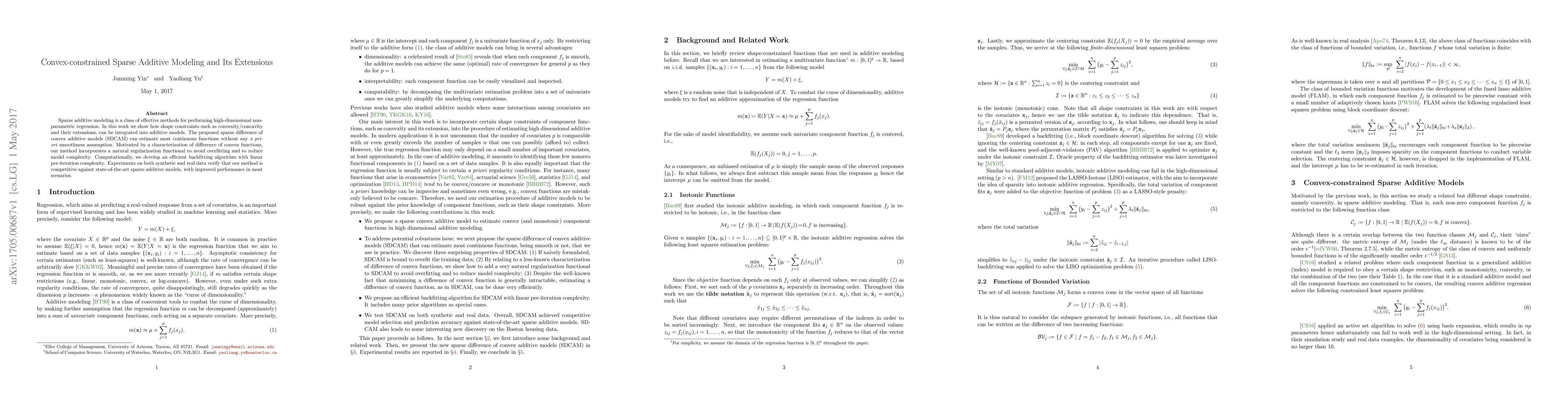 This paper proposes a convex-constrained sparse additive modeling method, termed SDCAM, which integrates shape constraints like convexity and concavity into additive models. The method uses a difference of convex functions approach with regularization to avoid overfitting and achieves competitive performance against state-of-the-art models, as demonstrated through synthetic and real data experiments.
