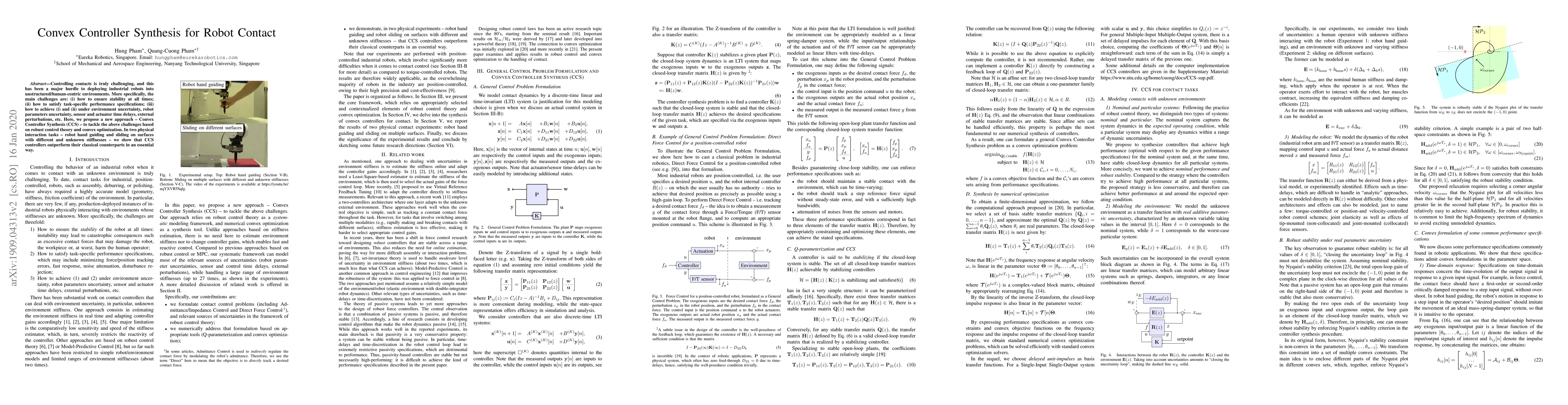 Controlling contacts is truly challenging, and this has been a major hurdle to deploying industrial robots into unstructured/human-centric environments. More specifically, the main challenges are: (i) how to ensure stability at all times; (ii) how to satisfy task-specific performance specifications; (iii) how to achieve (i) and (ii) under environment uncertainty, robot parameters uncertainty, sensor and actuator time delays, external perturbations, etc. Here, we propose a new approach -- Convex Controller Synthesis (CCS) -- to tackle the above challenges based on robust control theory and convex optimization. In two physical interaction tasks -- robot hand guiding and sliding on surfaces with different and unknown stiffnesses -- we show that CCS controllers outperform their classical counterparts in an essential way.