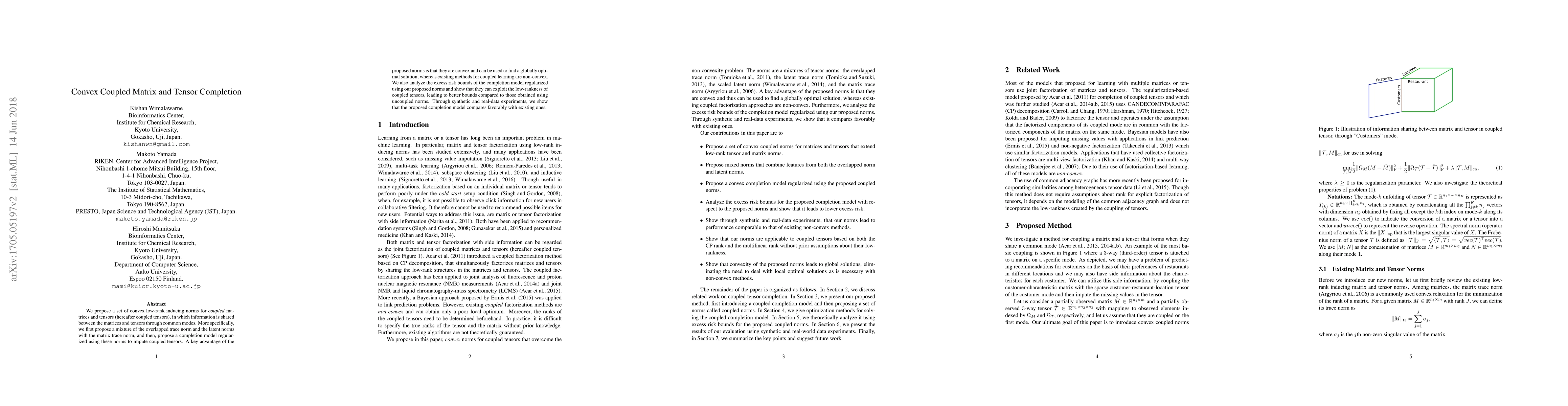 We propose a set of convex low rank inducing norms for a coupled matrices and tensors (hereafter coupled tensors), which shares information between matrices and tensors through common modes. More specifically, we propose a mixture of the overlapped trace norm and the latent norms with the matrix trace norm, and then, we propose a new completion algorithm based on the proposed norms. A key advantage of the proposed norms is that it is convex and can find a globally optimal solution, while existing methods for coupled learning are non-convex. Furthermore, we analyze the excess risk bounds of the completion model regularized by our proposed norms which show that our proposed norms can exploit the low rankness of coupled tensors leading to better bounds compared to uncoupled norms. Through synthetic and real-world data experiments, we show that the proposed completion algorithm compares favorably with existing completion algorithms.