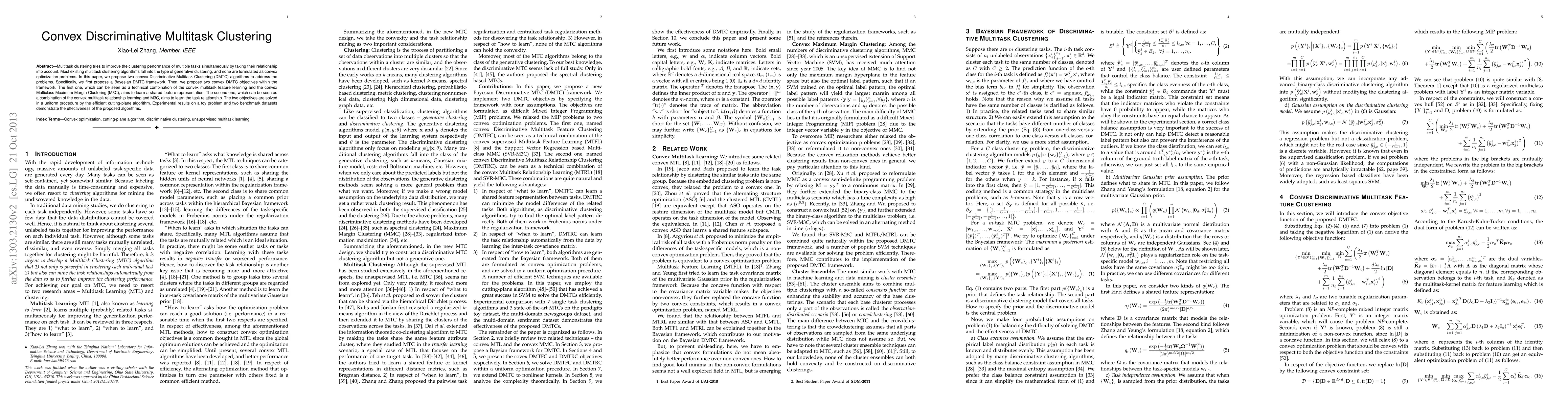 This paper introduces two convex Discriminative Multitask Clustering (DMTC) algorithms to improve clustering performance across multiple tasks by leveraging their relationships. The proposed algorithms combine convex multitask feature learning and Multiclass Maximum Margin Clustering (M3C) to learn shared features and task relationships, respectively, and are solved efficiently using a cutting-plane method.