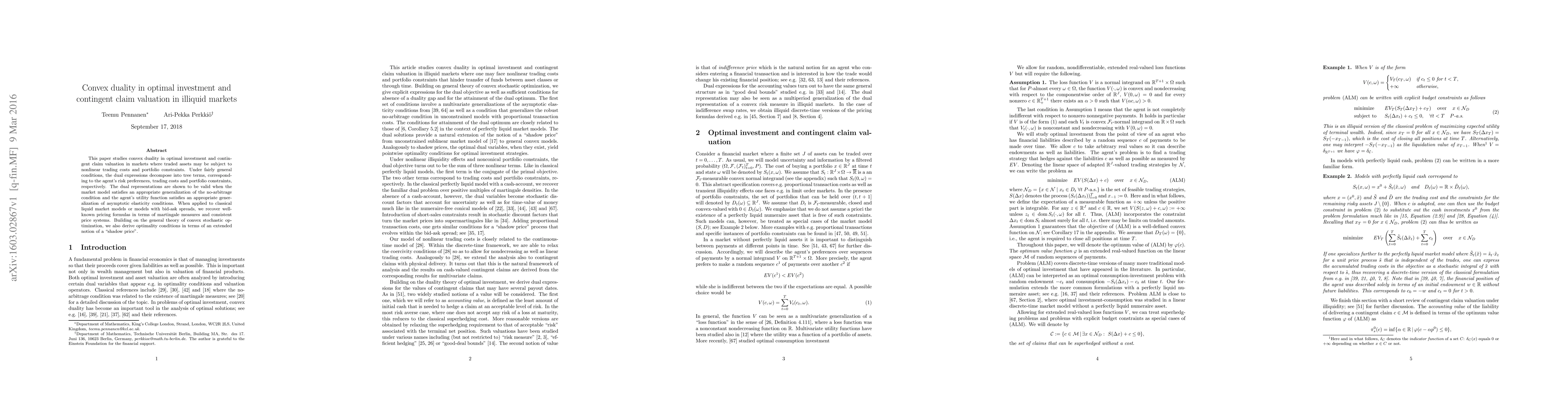 This paper studies convex duality in optimal investment and contingent claim valuation in markets where traded assets may be subject to nonlinear trading costs and portfolio constraints. Under fairly general conditions, the dual expressions decompose into tree terms, corresponding to the agent's risk preferences, trading costs and portfolio constraints, respectively. The dual representations are shown to be valid when the market model satisfies an appropriate generalization of the no-arbitrage condition and the agent's utility function satisfies an appropriate generalization of asymptotic elasticity conditions. When applied to classical liquid market models or models with bid-ask spreads, we recover well-known pricing formulas in terms of martingale measures and consistent price systems. Building on the general theory of convex stochastic optimization, we also derive optimality conditions in terms of an extended notion of a "shadow price".