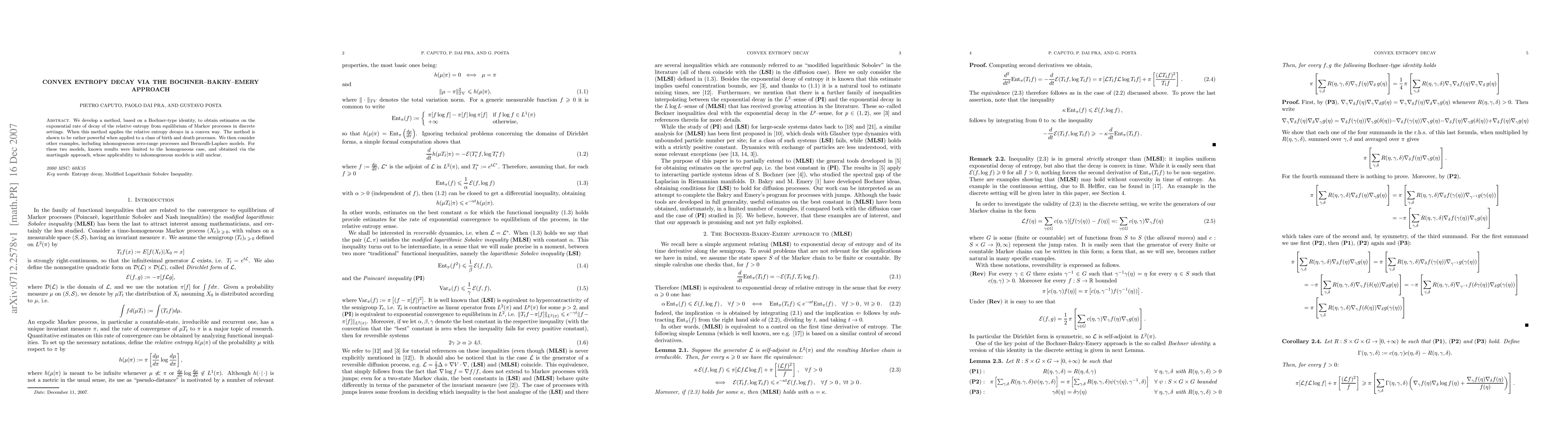 We develop a method, based on a Bochner-type identity, to obtain estimates on the exponential rate of decay of the relative entropy from equilibrium of Markov processes in discrete settings. When this method applies the relative entropy decays in a convex way. The method is shown to be rather powerful when applied to a class of birth and death processes. We then consider other examples, including inhomogeneous zero-range processes and Bernoulli-Laplace models. For these two models, known results were limited to the homogeneous case, and obtained via the martingale approach, whose applicability to inhomogeneous models is still unclear.