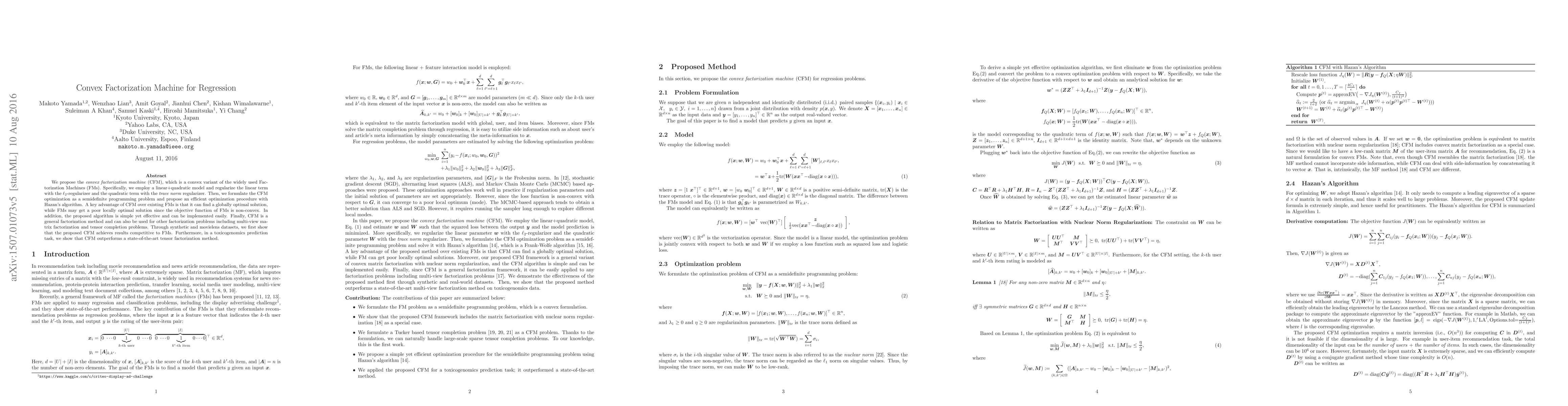 We propose the convex factorization machine (CFM), which is a convex variant of the widely used Factorization Machines (FMs). Specifically, we employ a linear+quadratic model and regularize the linear term with the $\ell_2$-regularizer and the quadratic term with the trace norm regularizer. Then, we formulate the CFM optimization as a semidefinite programming problem and propose an efficient optimization procedure with Hazan's algorithm. A key advantage of CFM over existing FMs is that it can find a globally optimal solution, while FMs may get a poor locally optimal solution since the objective function of FMs is non-convex. In addition, the proposed algorithm is simple yet effective and can be implemented easily. Finally, CFM is a general factorization method and can also be used for other factorization problems including including multi-view matrix factorization and tensor completion problems. Through synthetic and movielens datasets, we first show that the proposed CFM achieves results competitive to FMs. Furthermore, in a toxicogenomics prediction task, we show that CFM outperforms a state-of-the-art tensor factorization method.