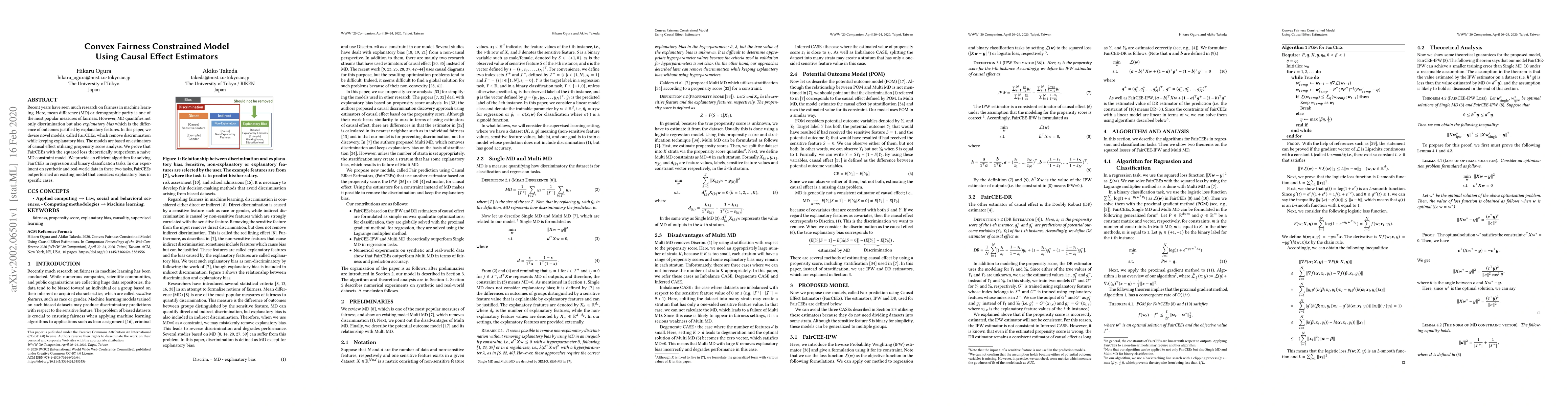 Recent years have seen much research on fairness in machine learning. Here, mean difference (MD) or demographic parity is one of the most popular measures of fairness. However, MD quantifies not only discrimination but also explanatory bias which is the difference of outcomes justified by explanatory features. In this paper, we devise novel models, called FairCEEs, which remove discrimination while keeping explanatory bias. The models are based on estimators of causal effect utilizing propensity score analysis. We prove that FairCEEs with the squared loss theoretically outperform a naive MD constraint model. We provide an efficient algorithm for solving FairCEEs in regression and binary classification tasks. In our experiment on synthetic and real-world data in these two tasks, FairCEEs outperformed an existing model that considers explanatory bias in specific cases.
