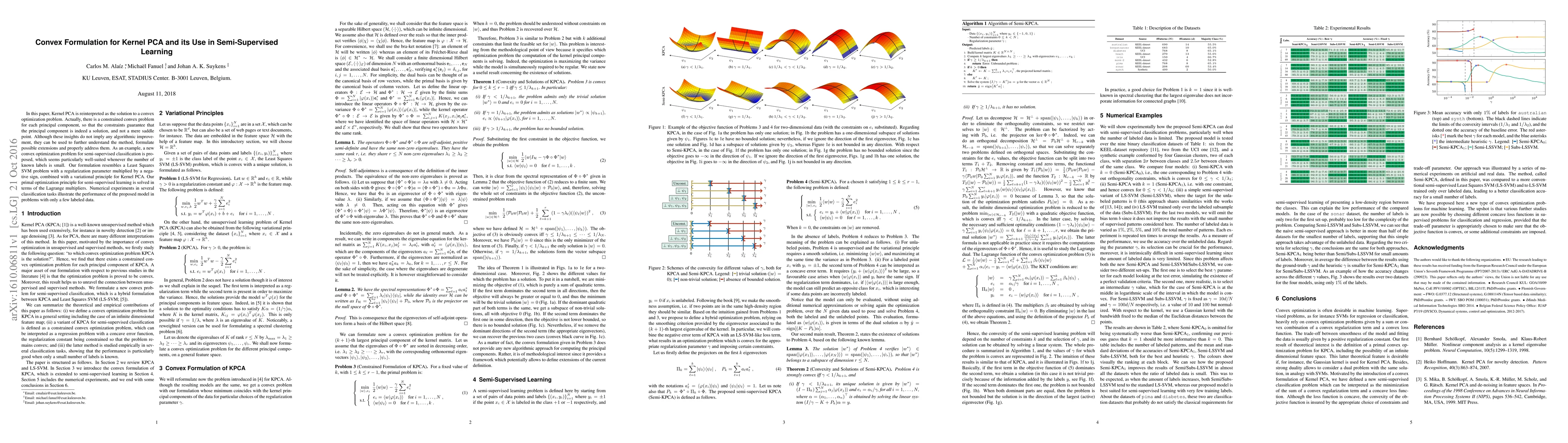 In this paper, Kernel PCA is reinterpreted as the solution to a convex optimization problem. Actually, there is a constrained convex problem for each principal component, so that the constraints guarantee that the principal component is indeed a solution, and not a mere saddle point. Although these insights do not imply any algorithmic improvement, they can be used to further understand the method, formulate possible extensions and properly address them. As an example, a new convex optimization problem for semi-supervised classification is proposed, which seems particularly well-suited whenever the number of known labels is small. Our formulation resembles a Least Squares SVM problem with a regularization parameter multiplied by a negative sign, combined with a variational principle for Kernel PCA. Our primal optimization principle for semi-supervised learning is solved in terms of the Lagrange multipliers. Numerical experiments in several classification tasks illustrate the performance of the proposed model in problems with only a few labeled data.
