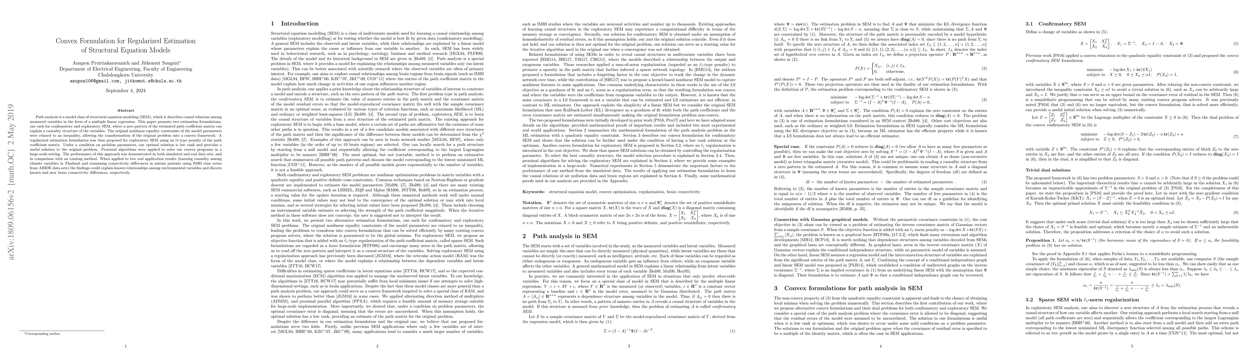 Path analysis is a model class of structural equation modeling (SEM), which it describes causal relations among measured variables in the form of a multiple linear regression. This paper presents two estimation formulations, one each for confirmatory and exploratory SEM, where a zero pattern of the estimated path coefficient matrix can explain a causality structure of the variables. The original nonlinear equality constraints of the model parameters were relaxed to an inequality, allowing the transformation of the original problem into a convex framework. A regularized estimation formulation was then proposed for exploratory SEM using an l1-type penalty of the path coefficient matrix. Under a condition on problem parameters, our optimal solution is low rank and provides a useful solution to the original problem. Proximal algorithms were applied to solve our convex programs in a large-scale setting. The performance of this approach was demonstrated in both simulated and real data sets, and in comparison with an existing method. When applied to two real application results (learning causality among climate variables in Thailand and examining connectivity differences in autism patients using fMRI time series from ABIDE data sets) the findings could explain known relationships among environmental variables and discern known and new brain connectivity differences, respectively.