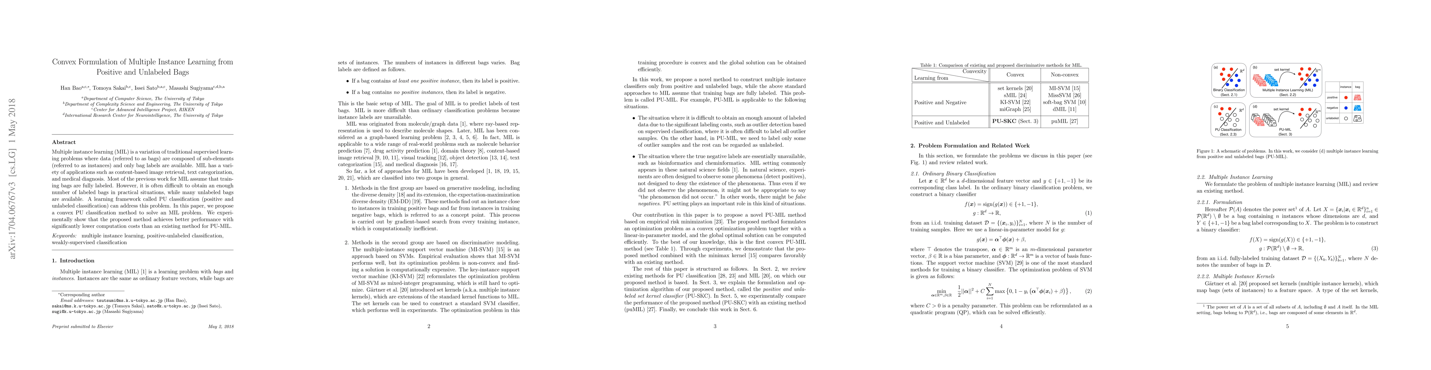 Multiple instance learning (MIL) is a variation of traditional supervised learning problems where data (referred to as bags) are composed of sub-elements (referred to as instances) and only bag labels are available. MIL has a variety of applications such as content-based image retrieval, text categorization and medical diagnosis. Most of the previous work for MIL assume that the training bags are fully labeled. However, it is often difficult to obtain an enough number of labeled bags in practical situations, while many unlabeled bags are available. A learning framework called PU learning (positive and unlabeled learning) can address this problem. In this paper, we propose a convex PU learning method to solve an MIL problem. We experimentally show that the proposed method achieves better performance with significantly lower computational costs than an existing method for PU-MIL.