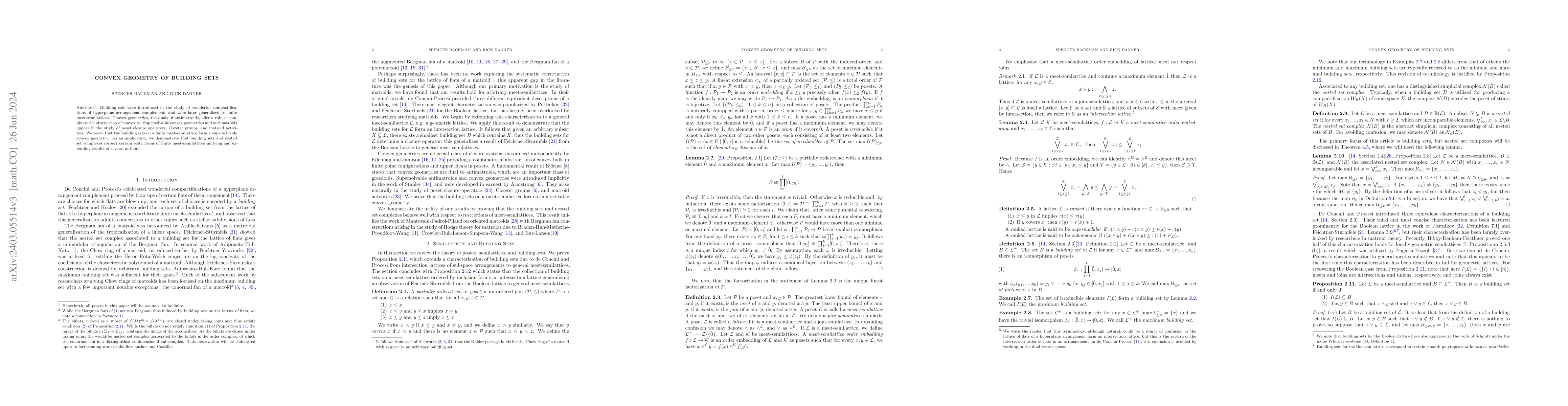 The paper proves that building sets on finite meet-semilattices form supersolvable convex geometries, providing a new combinatorial abstraction of convexity and extending previous results on nested set complexes and poset closure operators.