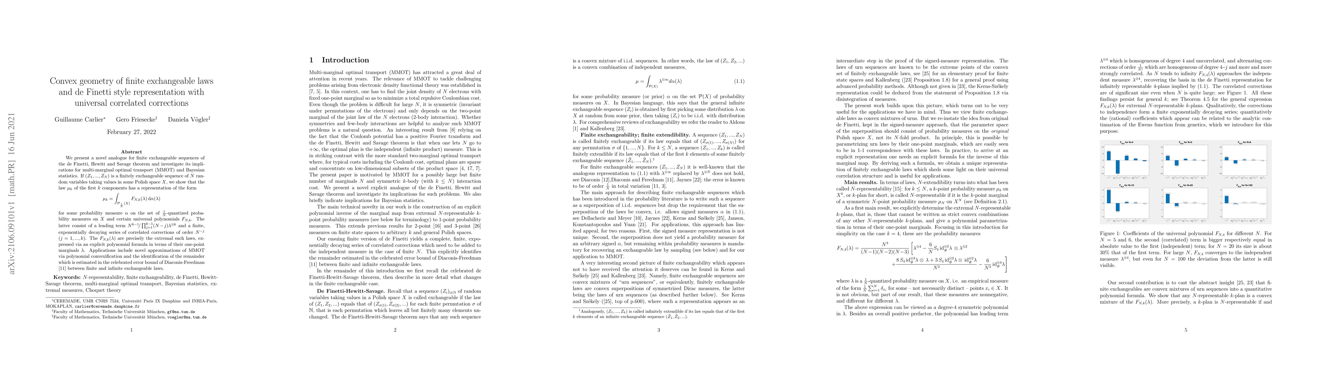 We present a novel analogue for finite exchangeable sequences of the de Finetti, Hewitt and Savage theorem and investigate its implications for multi-marginal optimal transport (MMOT) and Bayesian statistics. If $(Z_1,...,Z_N)$ is a finitely exchangeable sequence of $N$ random variables taking values in some Polish space $X$, we show that the law $\mu_k$ of the first $k$ components has a representation of the form $\mu_k=\int_{{\mathcal P}_{\frac{1}{N}}(X)} F_{N,k}(\lambda) \, \mbox{d} \alpha(\lambda)$ for some probability measure $\alpha$ on the set of $1/N$-quantized probability measures on $X$ and certain universal polynomials $F_{N,k}$. The latter consist of a leading term $N^{k-1}\! /{\small \prod_{j=1}^{k-1}(N\! -\! j)\, \lambda^{\otimes k}}$ and a finite, exponentially decaying series of correlated corrections of order $N^{-j}$ ($j=1,...,k$). The $F_{N,k}(\lambda)$ are precisely the extremal such laws, expressed via an explicit polynomial formula in terms of their one-point marginals $\lambda$. Applications include novel approximations of MMOT via polynomial convexification and the identification of the remainder which is estimated in the celebrated error bound of Diaconis-Freedman between finite and infinite exchangeable laws.
