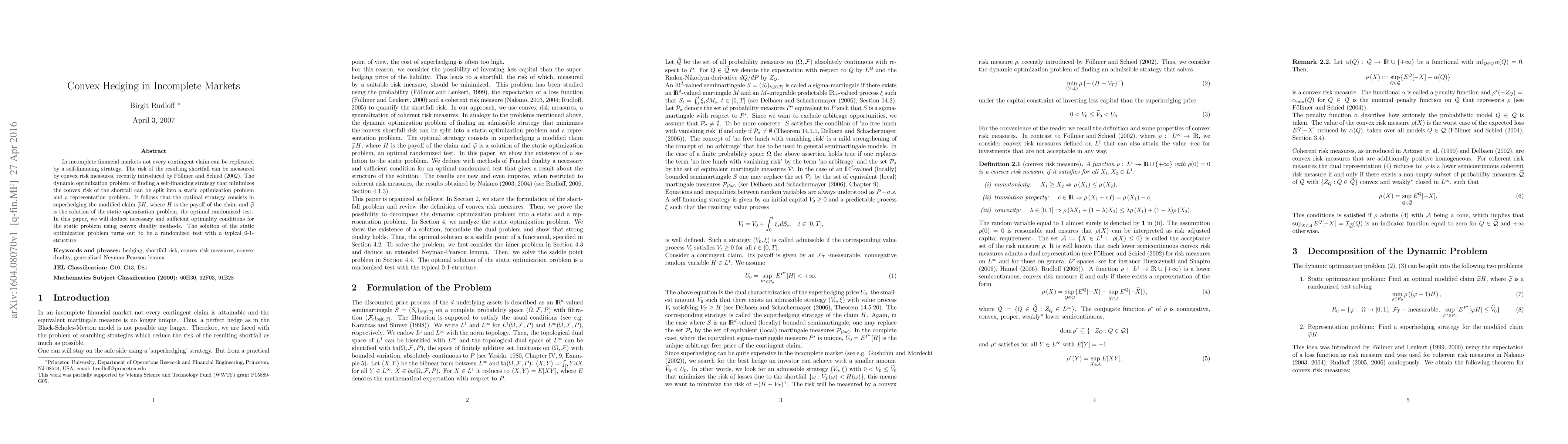 This paper explores convex hedging in incomplete financial markets, where not all contingent claims can be replicated. It deduces necessary and sufficient conditions for optimal static hedging using convex duality, revealing that the optimal strategy involves superhedging a modified claim through a randomized test with a typical $0$-$1$ structure.