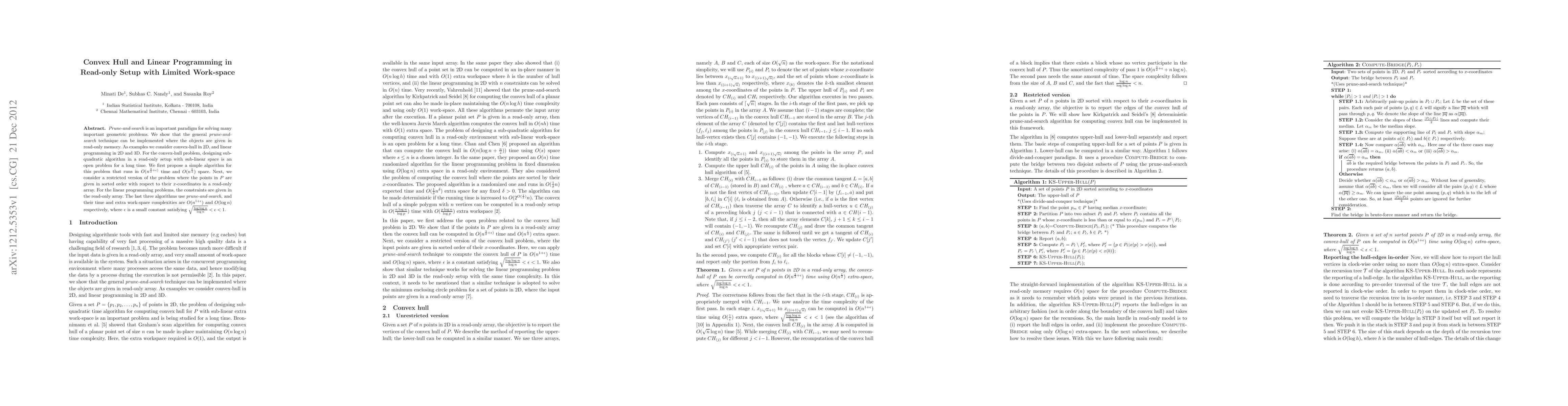 Prune-and-search is an important paradigm for solving many important geometric problems. We show that the general prune-and-search technique can be implemented where the objects are given in read-only memory. As examples we consider convex-hull in 2D, and linear programming in 2D and 3D. For the convex-hull problem, designing sub-quadratic algorithm in a read-only setup with sub-linear space is an open problem for a long time. We first propose a simple algorithm for this problem that runs in $O(n^{3/2+\epsilon)}$ time and $O(n^(1/2))$ space. Next, we consider a restricted version of the problem where the points in $P$ are given in sorted order with respect to their $x$-coordinates in a read-only array. For the linear programming problems, the constraints are given in the read-only array. The last three algorithms use {\it prune-and-search}, and their time and extra work-space complexities are $O(n^{1 + \epsilon})$ and $O(\log n)$ respectively, where $\epsilon$ is a small constant satisfying $\sqrt{\frac{\log\log n}{\log n}} < \epsilon < 1$.
