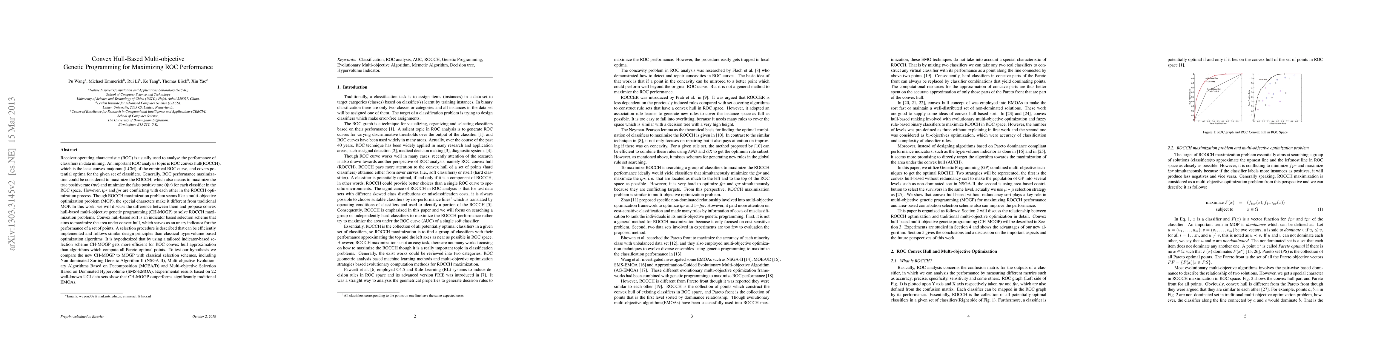 This paper proposes a convex hull-based multi-objective genetic programming (CH-MOGP) approach to maximize ROC performance in data mining classifiers. The CH-MOGP uses a tailored selection scheme to efficiently approximate the ROC convex hull, outperforming traditional evolutionary multi-objective algorithms and machine learning methods on 22 UCI datasets.