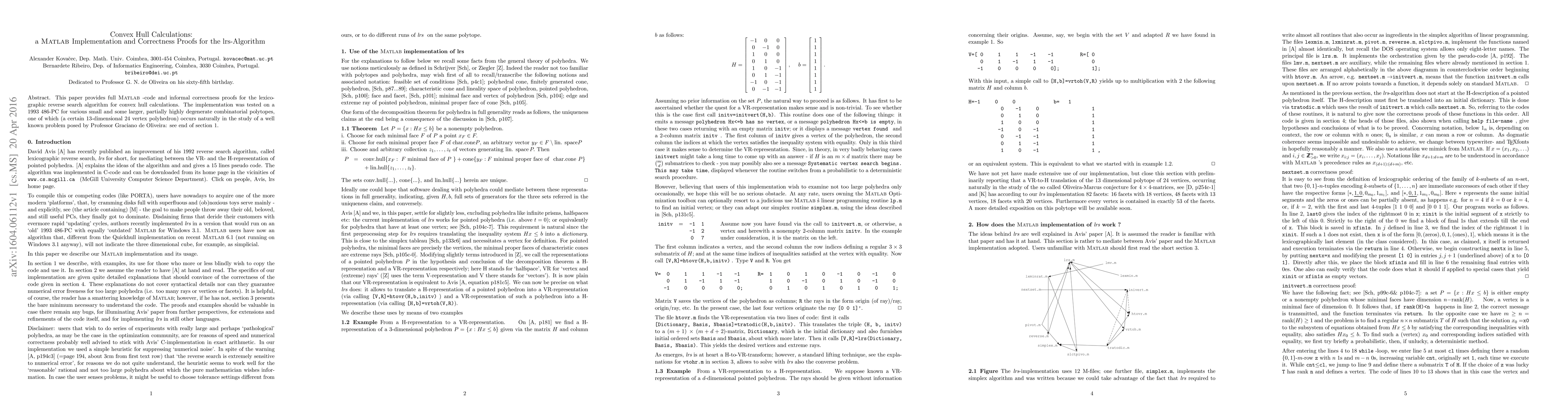 This paper presents a Matlab implementation and informal correctness proofs for the lexicographic reverse search algorithm to compute convex hulls. The implementation was tested on various small and larger, sometimes highly degenerate, combinatorial polytopes, including a 13-dimensional 24 vertex polyhedron relevant to a problem by Professor Graciano de Oliveira.