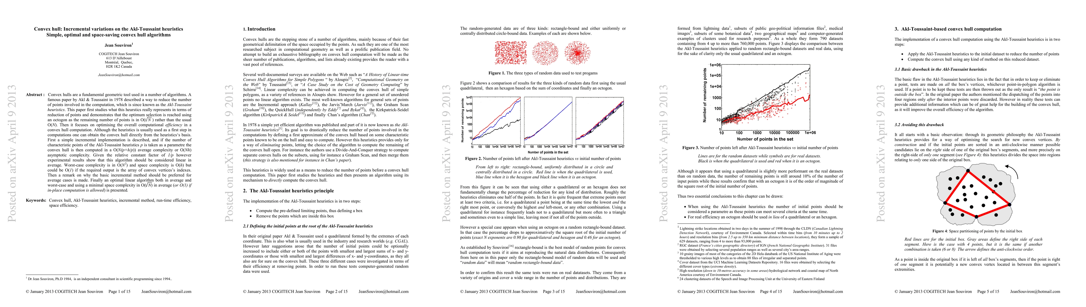 This paper improves convex hull algorithms using the Akl-Toussaint heuristics, achieving average complexity of O(Nh) and asymptotic complexity of O(sqrt(N)), with a minimal space complexity of O(sqrt(N)) or O(1)