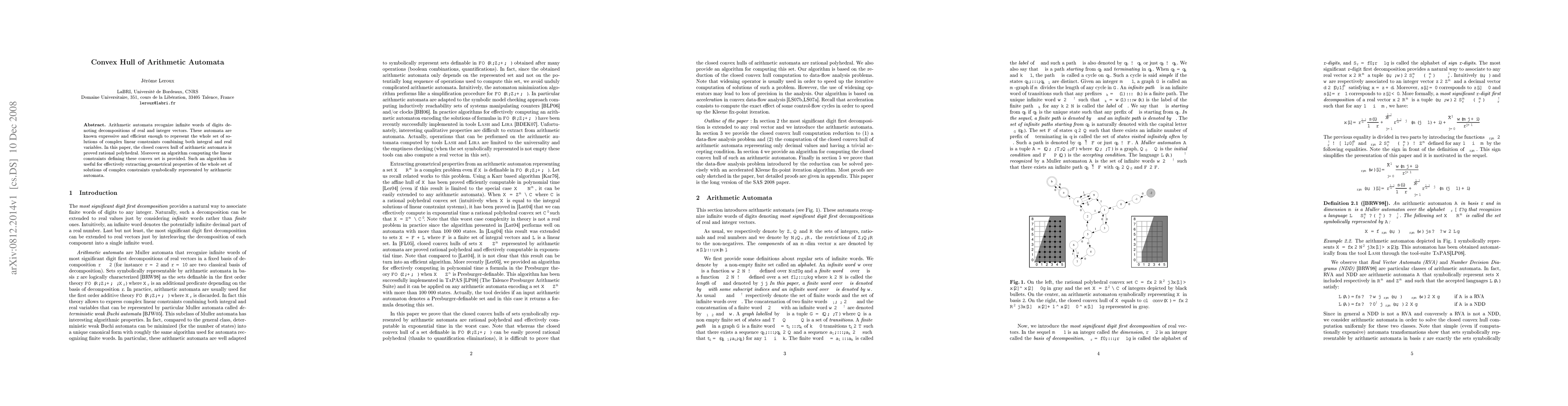 Arithmetic automata recognize infinite words of digits denoting decompositions of real and integer vectors. These automata are known expressive and efficient enough to represent the whole set of solutions of complex linear constraints combining both integral and real variables. In this paper, the closed convex hull of arithmetic automata is proved rational polyhedral. Moreover an algorithm computing the linear constraints defining these convex set is provided. Such an algorithm is useful for effectively extracting geometrical properties of the whole set of solutions of complex constraints symbolically represented by arithmetic automata.