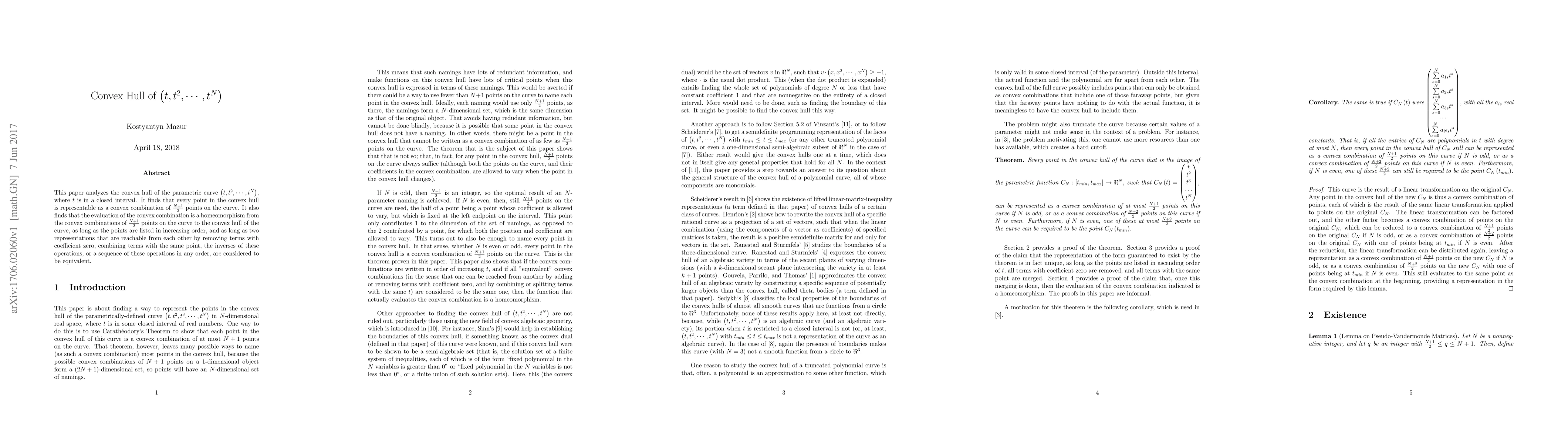 This paper analyzes the convex hull of the parametric curve $\left(t, t^2, \cdots, t^N\right)$, where $t$ is in a closed interval. It finds that every point in the convex hull is representable as a convex combination of $\frac{N+1}{2}$ points on the curve. It also finds that the evaluation of the convex combination is a homeomorphism from the convex combinations of $\frac{N+1}{2}$ points on the curve to the convex hull of the curve, as long as the points are listed in increasing order, and as long as two representations that are reachable from each other by removing terms with coefficient zero, combining terms with the same point, the inverses of these operations, or a sequence of these operations in any order, are considered to be equivalent.