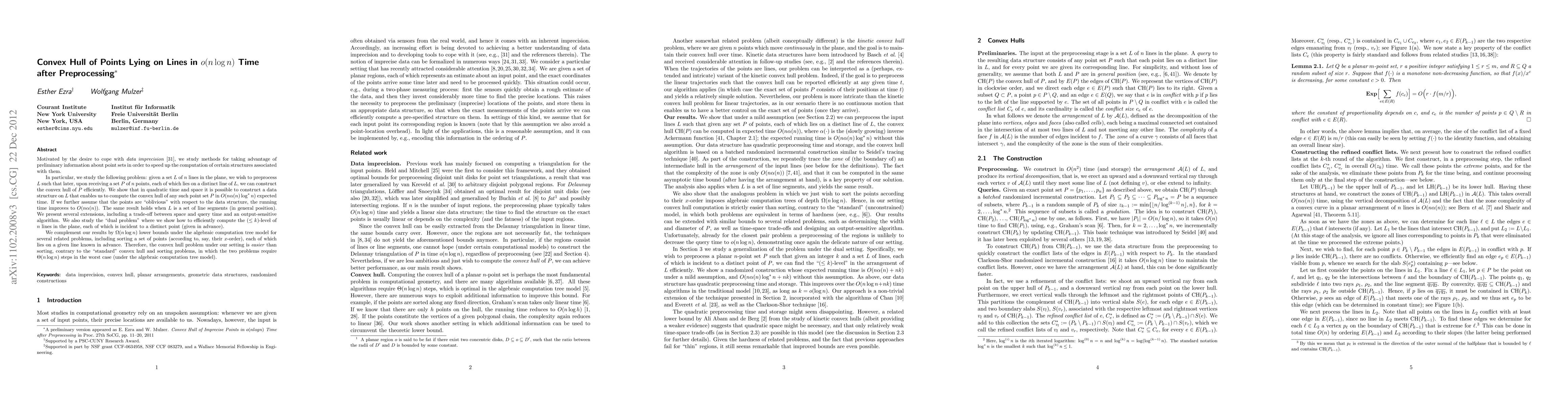 Motivated by the desire to cope with data imprecision, we study methods for taking advantage of preliminary information about point sets in order to speed up the computation of certain structures associated with them. In particular, we study the following problem: given a set L of n lines in the plane, we wish to preprocess L such that later, upon receiving a set P of n points, each of which lies on a distinct line of L, we can construct the convex hull of P efficiently. We show that in quadratic time and space it is possible to construct a data structure on L that enables us to compute the convex hull of any such point set P in O(n alpha(n) log* n) expected time. If we further assume that the points are "oblivious" with respect to the data structure, the running time improves to O(n alpha(n)). The analysis applies almost verbatim when L is a set of line-segments, and yields similar asymptotic bounds. We present several extensions, including a trade-off between space and query time and an output-sensitive algorithm. We also study the "dual problem" where we show how to efficiently compute the (<= k)-level of n lines in the plane, each of which lies on a distinct point (given in advance). We complement our results by Omega(n log n) lower bounds under the algebraic computation tree model for several related problems, including sorting a set of points (according to, say, their x-order), each of which lies on a given line known in advance. Therefore, the convex hull problem under our setting is easier than sorting, contrary to the "standard" convex hull and sorting problems, in which the two problems require Theta(n log n) steps in the worst case (under the algebraic computation tree model).