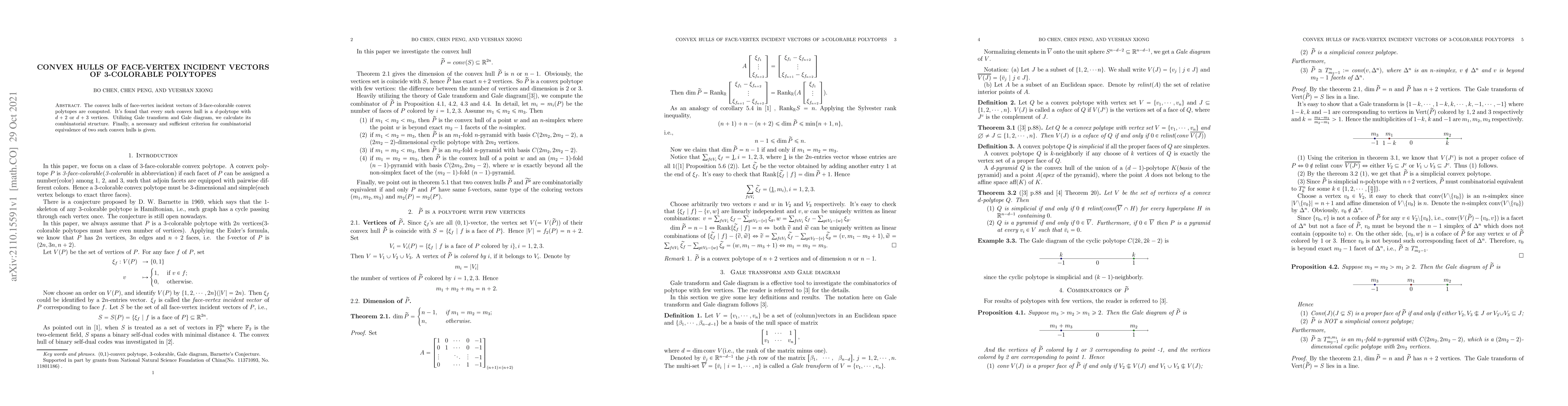 The convex hulls of face-vertex incident vectors of 3-face-colorable convex polytopes are computed. It is found that every such convex hull is a $d$-polytope with $d+2$ or $d+3$ vertices. Utilizing Gale transform and Gale diagram, we calculate its combinatorial structure. Finally, a necessary and sufficient criterion for combinatorial equivalence of two such convex hulls is given.