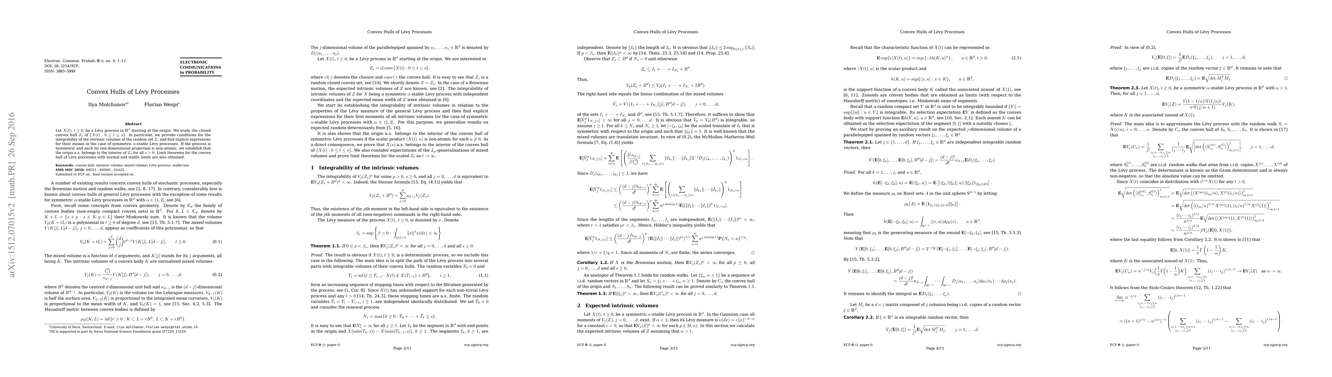 This paper investigates the closed convex hull $Z_s$ formed by a Lévy process $X(t)$ in $\mathbb{R}^d$, focusing on the conditions for the integrability of its intrinsic volumes and deriving explicit expressions for their means in the case of symmetric $\alpha$-stable Lévy processes. It also establishes that the origin belongs to the interior of $Z_s$ almost surely under certain symmetry and non-atomicity conditions.
