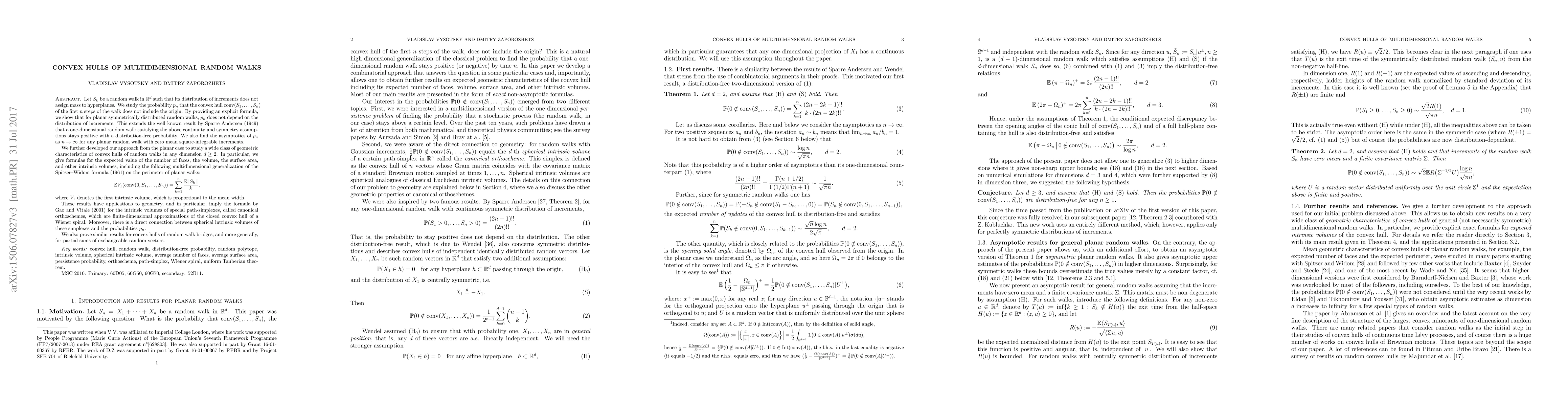 Let $S_k$ be a random walk in $R^d$ such that its distribution of increments does not assign mass to hyperplanes. We study the probability $p_n$ that the convex hull $conv (S_1, \ldots , S_n)$ of the first $n$ steps of the walk does not include the origin. By providing an explicit formula, we show that for planar symmetrically distributed random walks, $p_n$ does not depend on the distribution of increments. This extends the well known result by Sparre Andersen (1949) that a one-dimensional random walk satisfying the above continuity and symmetry assumptions stays positive with a distribution-free probability. We also find the asymptotics of $p_n$ as $n \to \infty$ for any planar random walk with zero mean square-integrable increments. We further developed our approach from the planar case to study a wide class of geometric characteristics of convex hulls of random walks in any dimension $d \ge 2$. In particular, we give formulas for the expected value of the number of faces, the volume, the surface area, and other intrinsic volumes, including the following multidimensional generalization of the Spitzer--Widom formula (1961) on the perimeter of planar walks: $$ E V_1 (conv(0, S_1, \dots, S_n)) = \sum_{k=1}^n \frac{E \|S_k\|}{k}, $$ where $V_1$ denotes the first intrinsic volume, which is proportional to the mean width. These results have applications to geometry, and in particular, imply the formula by Gao and Vitale (2001) for the intrinsic volumes of special path-simplexes, called canonical orthoschemes, which are finite-dimensional approximations of the closed convex hull of a Wiener spiral. Moreover, there is a direct connection between spherical intrinsic volumes of these simplexes and the probabilities $p_n$. We also prove similar results for convex hulls of random walk bridges, and more generally, for partial sums of exchangeable random vectors.