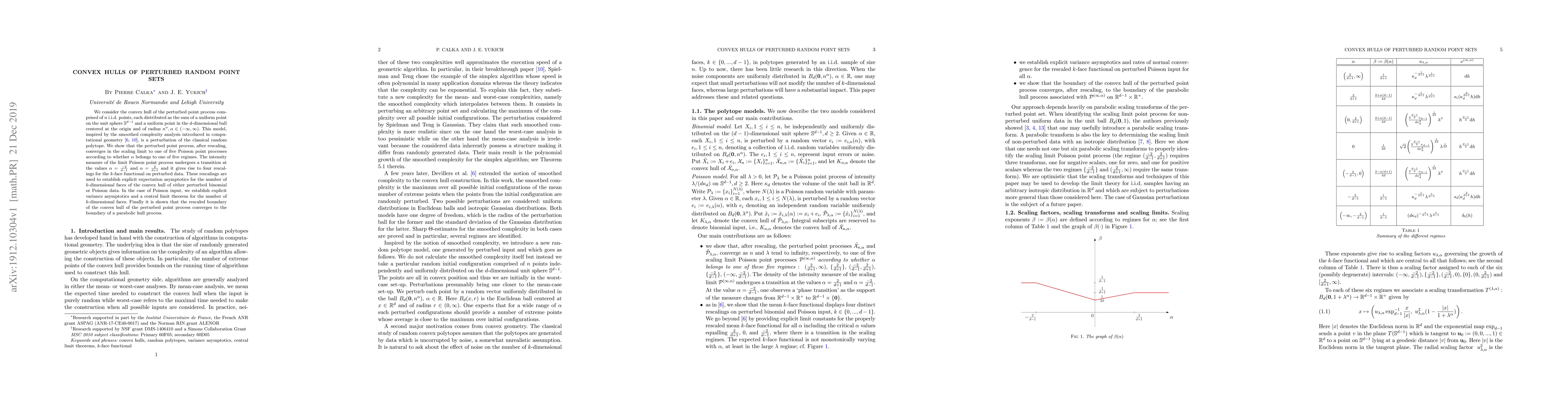 We consider the convex hull of the perturbed point process comprised of $n$ i.i.d. points, each distributed as the sum of a uniform point on the unit sphere $\S^{d-1}$ and a uniform point in the $d$-dimensional ball centered at the origin and of radius $n^{\alpha}, \alpha \in (-\infty, \infty)$. This model, inspired by the smoothed complexity analysis introduced in computational geometry \cite{DGGT,ST}, is a perturbation of the classical random polytope. We show that the perturbed point process, after rescaling, converges in the scaling limit to one of five Poisson point processes according to whether $\alpha$ belongs to one of five regimes. The intensity measure of the limit Poisson point process undergoes a transition at the values $\alpha = \frac{-2} {d -1}$ and $\alpha = \frac{2} {d + 1}$ and it gives rise to four rescalings for the $k$-face functional on perturbed data. These rescalings are used to establish explicit expectation asymptotics for the number of $k$-dimensional faces of the convex hull of either perturbed binomial or Poisson data. In the case of Poisson input, we establish explicit variance asymptotics and a central limit theorem for the number of $k$-dimensional faces. Finally it is shown that the rescaled boundary of the convex hull of the perturbed point process converges to the boundary of a parabolic hull process.