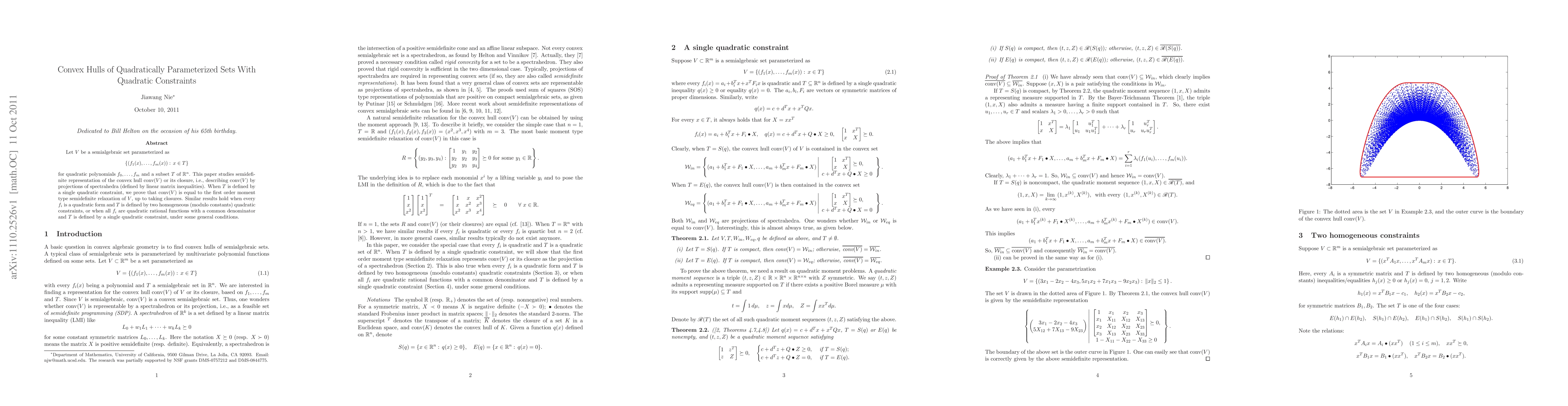 This paper explores the semidefinite representation of the convex hull of semialgebraic sets parameterized by quadratic polynomials, showing that it can be represented through projections of spectrahedra. When constrained by a single quadratic equation, the convex hull matches the first-order moment type semidefinite relaxation, up to closure.