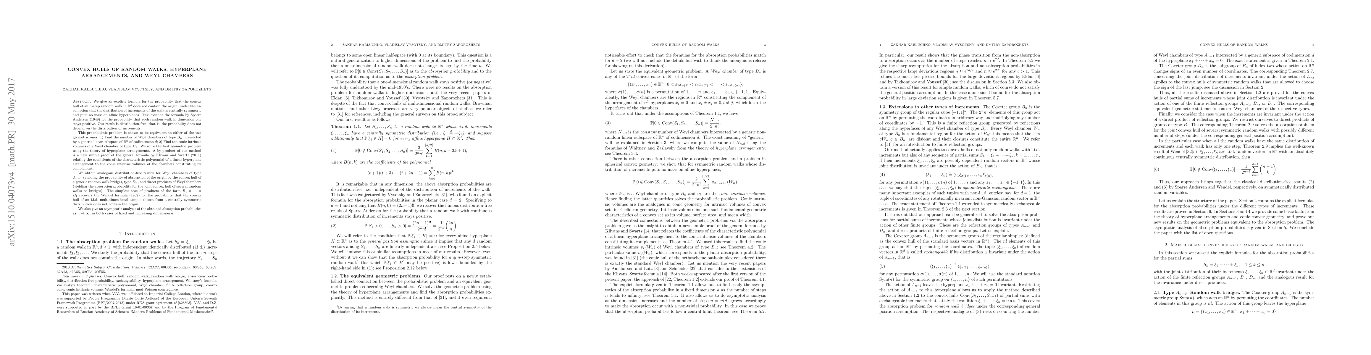 We give an explicit formula for the probability that the convex hull of an $n$-step random walk in $R^d$ does not contain the origin, under the assumption that the distribution of increments of the walk is centrally symmetric and puts no mass on affine hyperplanes. This extends the formula by Sparre Andersen (1949) for the probability that such random walk in dimension one stays positive. Our result is distribution-free, that is, the probability does not depend on the distribution of increments. This probabilistic problem is shown to be equivalent to either of the two geometric ones: 1) Find the number of Weyl chambers of type $B_n$ intersected by a generic linear subspace of $R^n$ of codimension $d$; 2) Find the conic intrinsic volumes of a Weyl chamber of type $B_n$. We solve the first geometric problem using the theory of hyperplane arrangements. A by-product of our method is a new simple proof of the general formula by Klivans and Swartz (2011) relating the coefficients of the characteristic polynomial of a linear hyperplane arrangement to the conic intrinsic volumes of the chambers constituting its complement. We obtain analogous distribution-free results for Weyl chambers of type $A_{n-1}$ (yielding the probability of absorption of the origin by the convex hull of a generic random walk bridge), type $D_n$, and direct products of Weyl chambers (yielding the absorption probability for the joint convex hull of several random walks or bridges). The simplest case of products of the form $B_1\times \dots \times B_1$ recovers the Wendel formula (1962) for the probability that the convex hull of an i.i.d. multidimensional sample chosen from a centrally symmetric distribution does not contain the origin. We also give an asymptotic analysis of the obtained absorption probabilities as $n \to \infty$, in both cases of fixed and increasing dimension $d$.