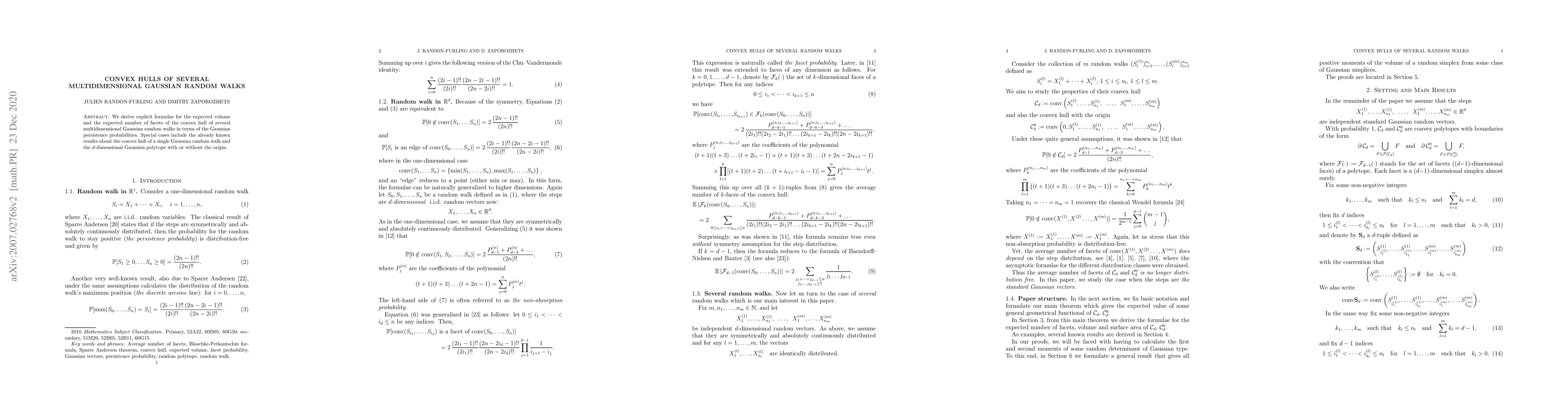 This paper provides explicit expressions for the expected volume and facet count of the convex hull formed by multiple multidimensional Gaussian random walks, utilizing Gaussian persistence probabilities. It also extends known results for single Gaussian random walks and $d$-dimensional Gaussian polytopes.