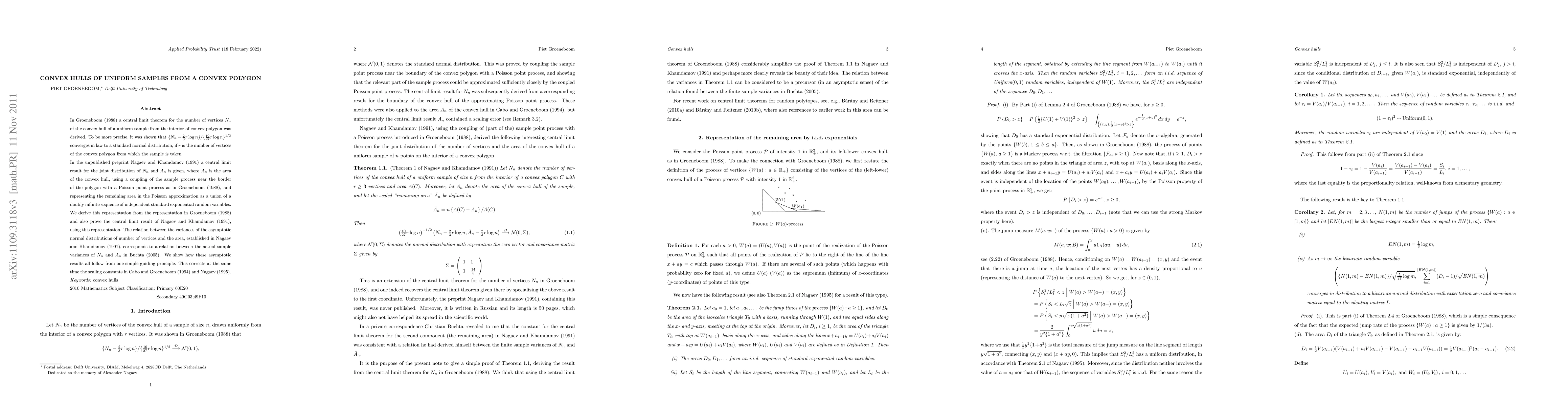 In Groeneboom (1988) a central limit theorem for the number of vertices of the convex hull of a uniform sample from the interior of convex polygon was derived. In the unpublished preprint Nagaev and Khamdamov (1991) (in Russian) a central limit result for the joint distribution of the number of vertices and the remaining area is given, using a coupling of the sample process near the border of the polygon with a Poisson point process as in Groeneboom (1988), and representing the remaining area in the Poisson approximation as a union of a doubly infinite sequence of independent standard exponential random variables. We derive this representation from the representation in Groeneboom (1988) and also prove the central limit result of Nagaev and Khamdamov (1991), using this representation. The relation between the variances of the asymptotic normal distributions of number of vertices and the area, established in Nagaev and Khamdamov (1991), corresponds to a relation between the actual sample variances of the number of vertices and the remaining area in Buchta (2005). We show how these asymptotic results all follow from one simple guiding principle. This corrects at the same time the scaling constants in Nagaev (1995) and Cabo and Groeneboom (1994).