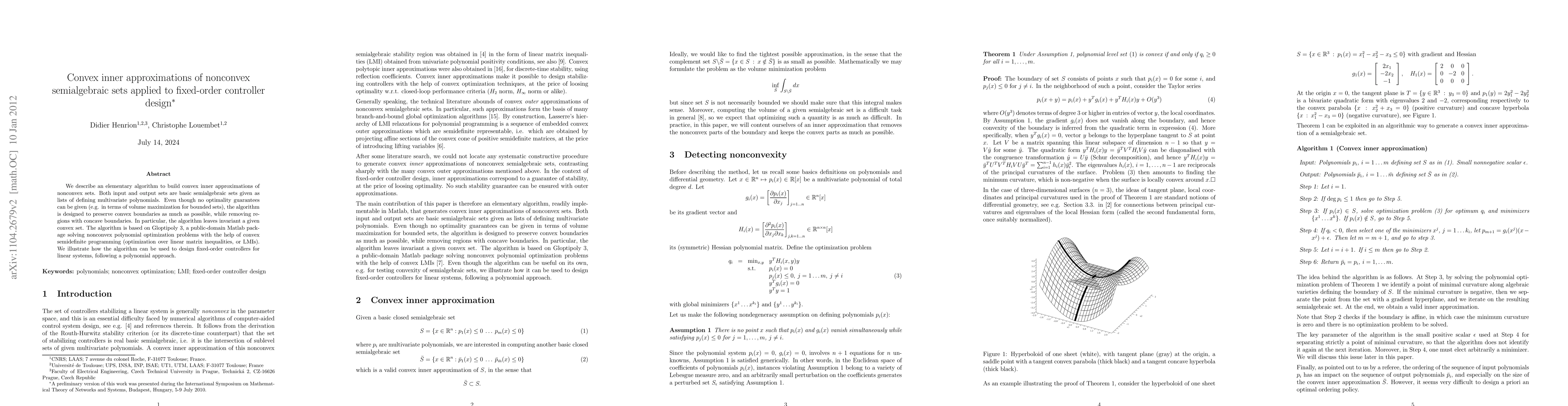 This paper proposes an algorithm for constructing convex inner approximations of nonconvex semialgebraic sets, aiming to preserve convex boundaries and utilize GloptiPoly 3 for solving polynomial optimization. The method is applied to design fixed-order controllers for linear systems using a polynomial approach.