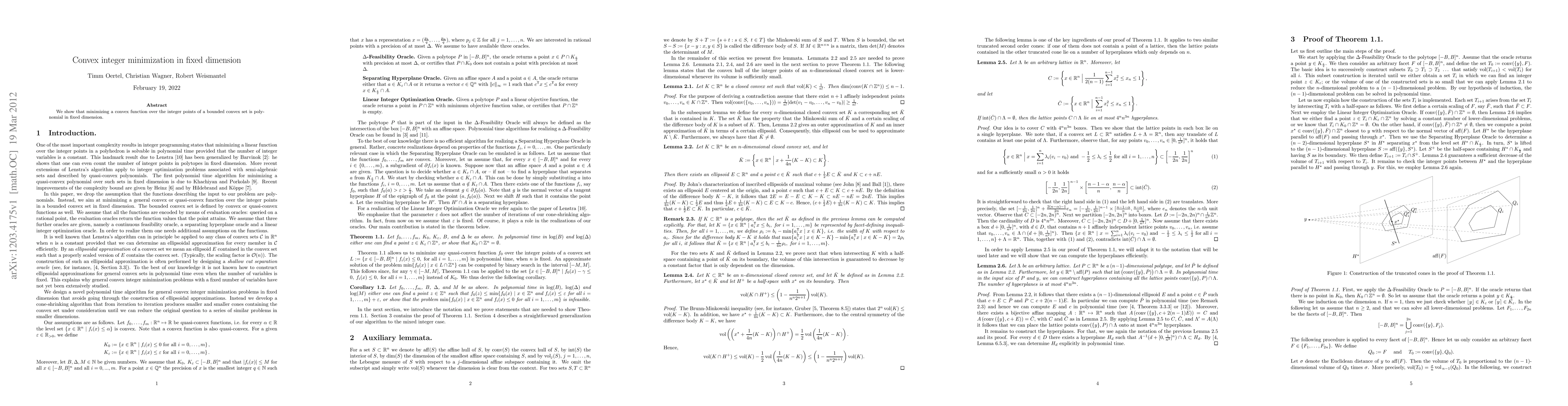 Summary: This paper demonstrates that convex integer minimization problems can be solved in polynomial time when the dimension of the bounded convex set is fixed. The result highlights the efficiency of such optimizations under these constraints.