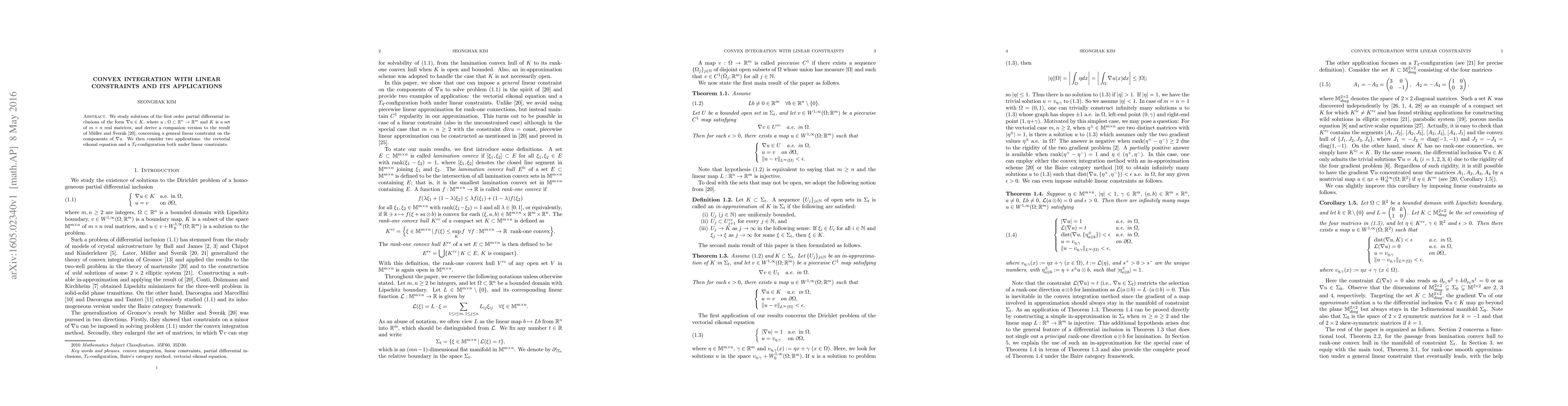 We study solutions of the first order partial differential inclusions of the form $\nabla u\in K$, where $u:\Omega\subset\mathbb{R}^n\to\mathbb{R}^m$ and $K$ is a set of $m\times n$ real matrices, and derive a companion version to the result of {M\"uller and \v{S}ver\'ak} [20], concerning a general linear constraint on the components of $\nabla u$. We then consider two applications: the vectorial eikonal equation and a $T_4$-configuration both under linear constraints.