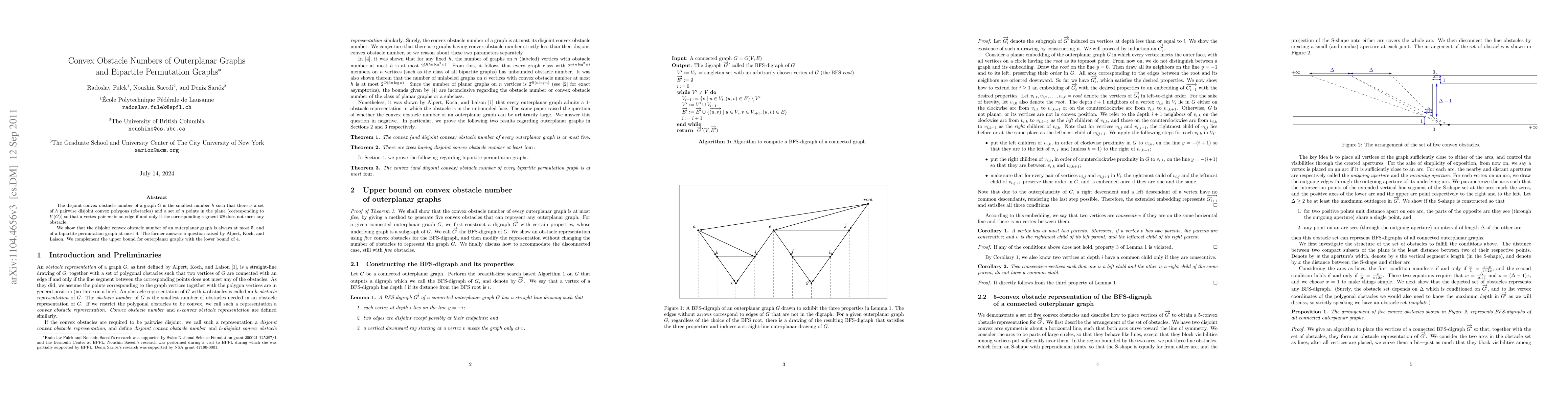 Summary: This paper determines the disjoint convex obstacle number for outerplanar and bipartite permutation graphs, showing that outerplanar graphs require at most 5 obstacles while bipartite permutation graphs need at most 4. This resolves a question posed by Alpert, Koch, and Laison and provides a complementary lower bound of 4 for outerplanar graphs.