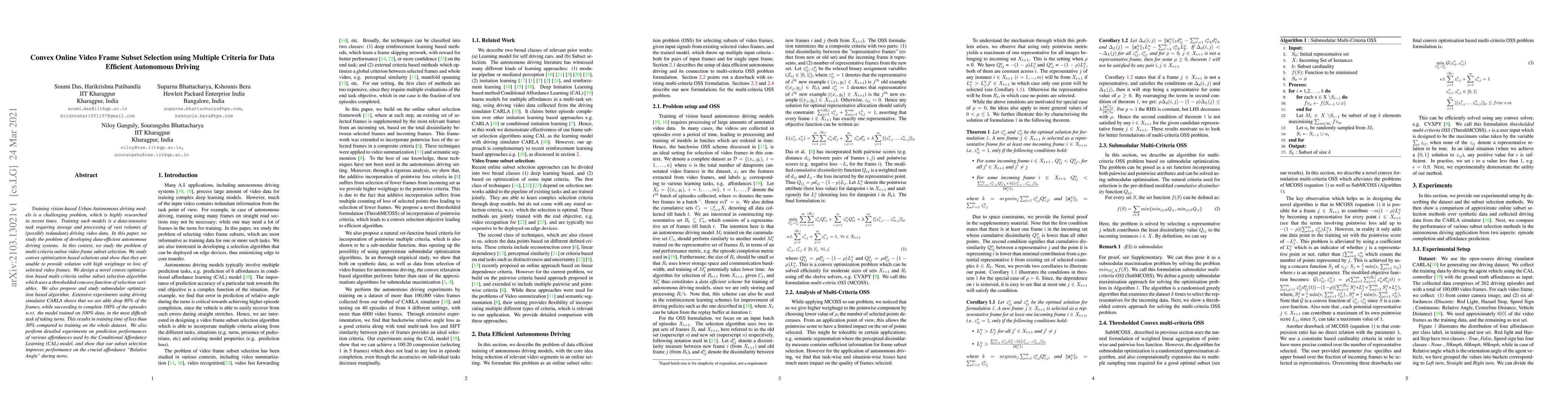Training vision-based Urban Autonomous driving models is a challenging problem, which is highly researched in recent times. Training such models is a data-intensive task requiring the storage and processing of vast volumes of (possibly redundant) driving video data. In this paper, we study the problem of developing data-efficient autonomous driving systems. In this context, we study the problem of multi-criteria online video frame subset selection. We study convex optimization-based solutions and show that they are unable to provide solutions with high weightage to the loss of selected video frames. We design a novel convex optimization-based multi-criteria online subset selection algorithm that uses a thresholded concave function of selection variables. We also propose and study a submodular optimization-based algorithm. Extensive experiments using the driving simulator CARLA show that we are able to drop 80% of the frames while succeeding to complete 100% of the episodes w.r.t. the model trained on 100% data, in the most difficult task of taking turns. This results in a training time of less than 30% compared to training on the whole dataset. We also perform detailed experiments on prediction performances of various affordances used by the Conditional Affordance Learning (CAL) model and show that our subset selection improves performance on the crucial affordance "Relative Angle" during turns.