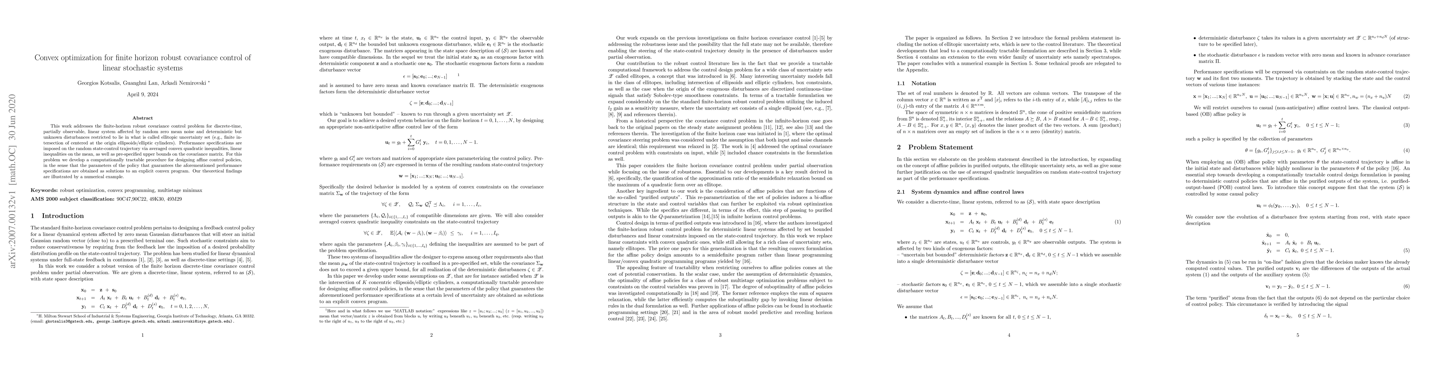 This paper presents a convex optimization approach for designing robust covariance control policies for discrete-time linear stochastic systems under finite-horizon constraints. The method guarantees performance specifications via convex quadratic inequalities and is computationally tractable, demonstrated through a numerical example.