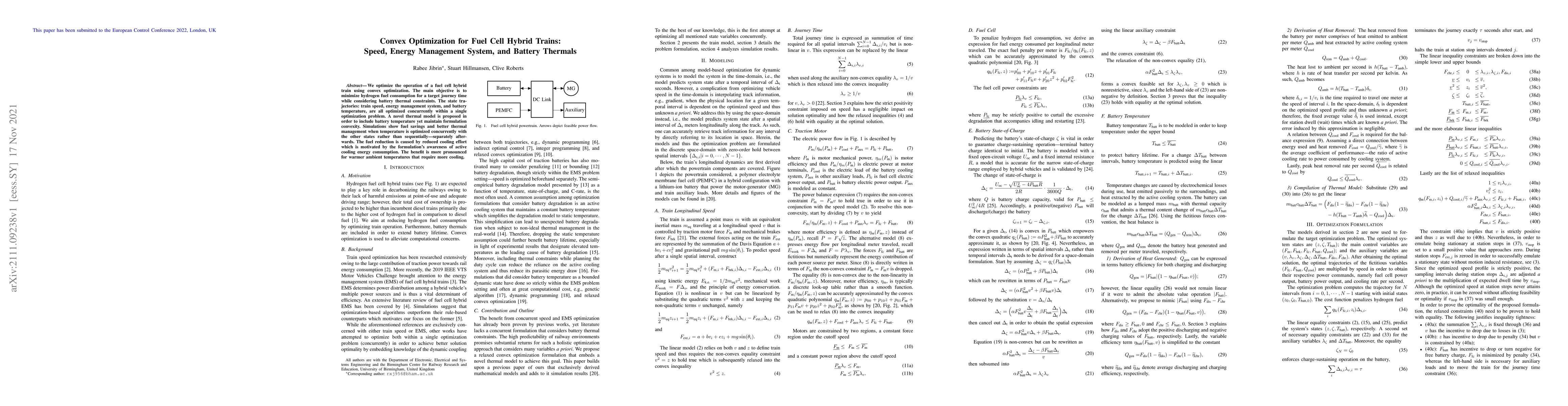 This paper optimizes the operation of a fuel cell hybrid train using convex optimization to minimize hydrogen fuel consumption while managing battery thermal constraints. A novel thermal model ensures convexity, leading to fuel savings and improved thermal management by optimizing temperature concurrently with speed and energy management.
