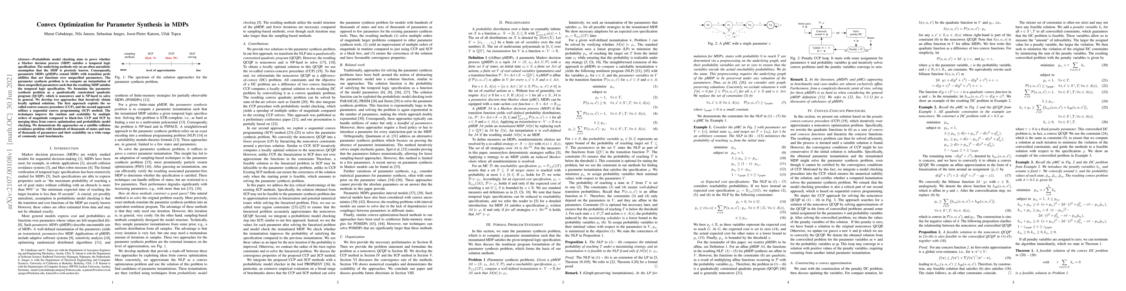 The research proposes two iterative approaches for parameter synthesis in pMDPs, leveraging convex optimization techniques. The first approach uses the convex-concave procedure (CCP), while the second employs sequential convex programming (SCP). These methods significantly improve runtime and scalability compared to standard CCP and SCP, merging ideas from convex optimization and probabilistic model checking.