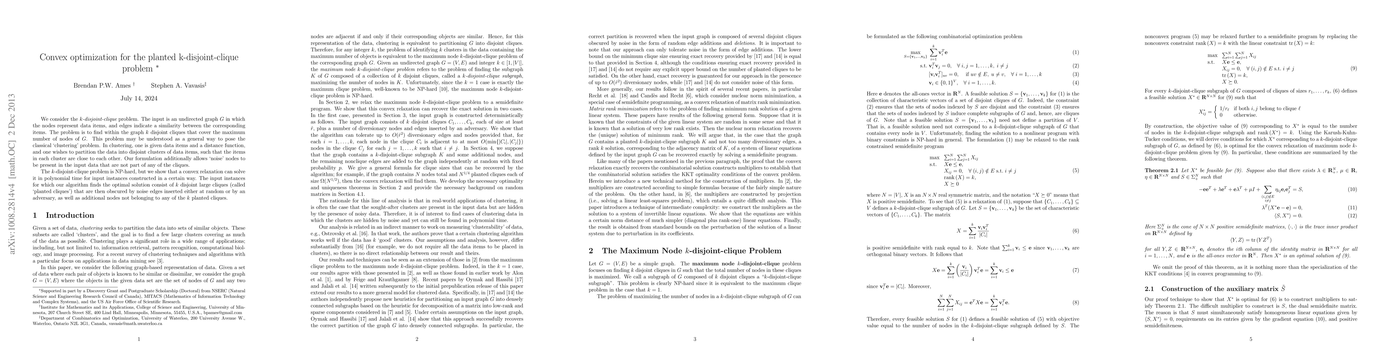 This paper proposes a convex optimization approach to solve the NP-hard k-disjoint-clique problem, which involves finding k disjoint cliques in a graph to maximize node coverage, akin to clustering. The authors demonstrate that their method can find optimal solutions for specially constructed instances with planted large cliques obscured by noise.