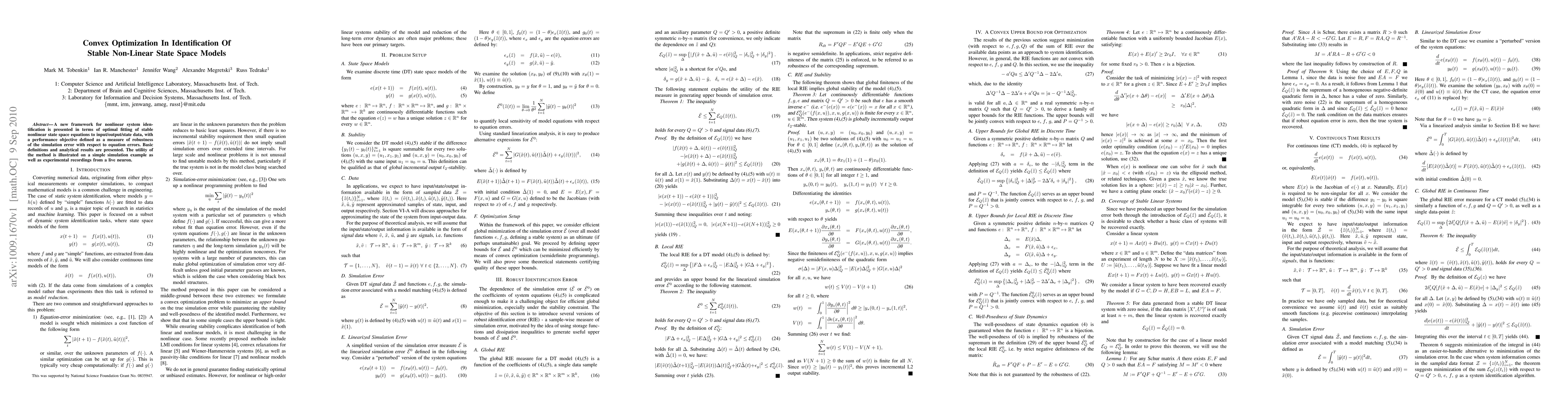 This paper introduces a convex optimization framework for identifying stable nonlinear state space models through optimal fitting, emphasizing robustness of simulation error. The method is demonstrated through simulations and experimental data from a live neuron.