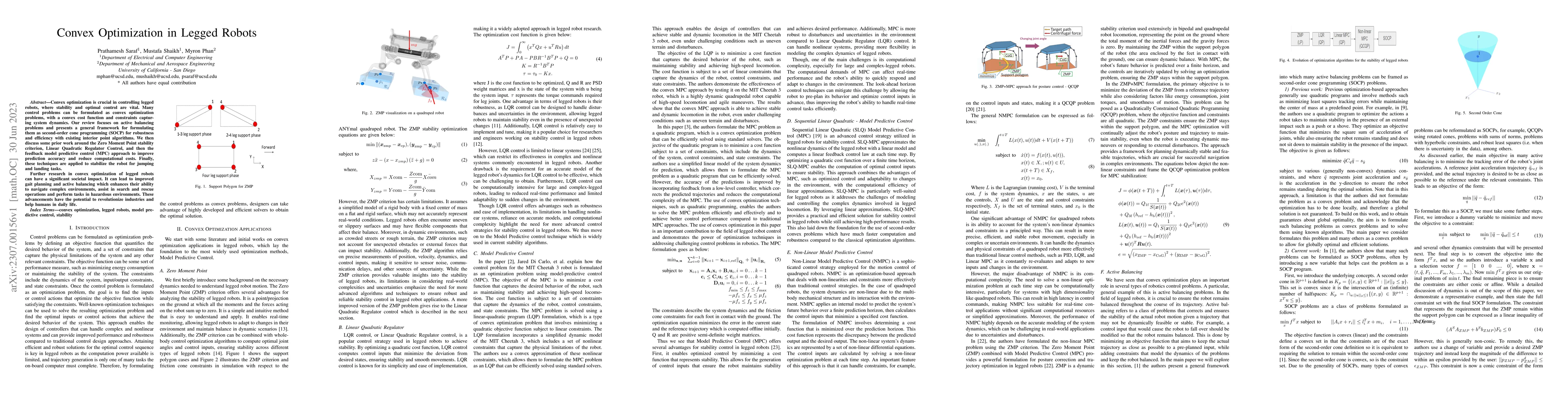This paper reviews convex optimization techniques for controlling legged robots, focusing on active balancing via second-order cone programming (SOCP). It discusses methods like Zero Moment Point stability, Linear Quadratic Regulator Control, and feedback model predictive control (MPC) to enhance stability and efficiency, and applies these to stabilize robots during jumping and landing tasks.