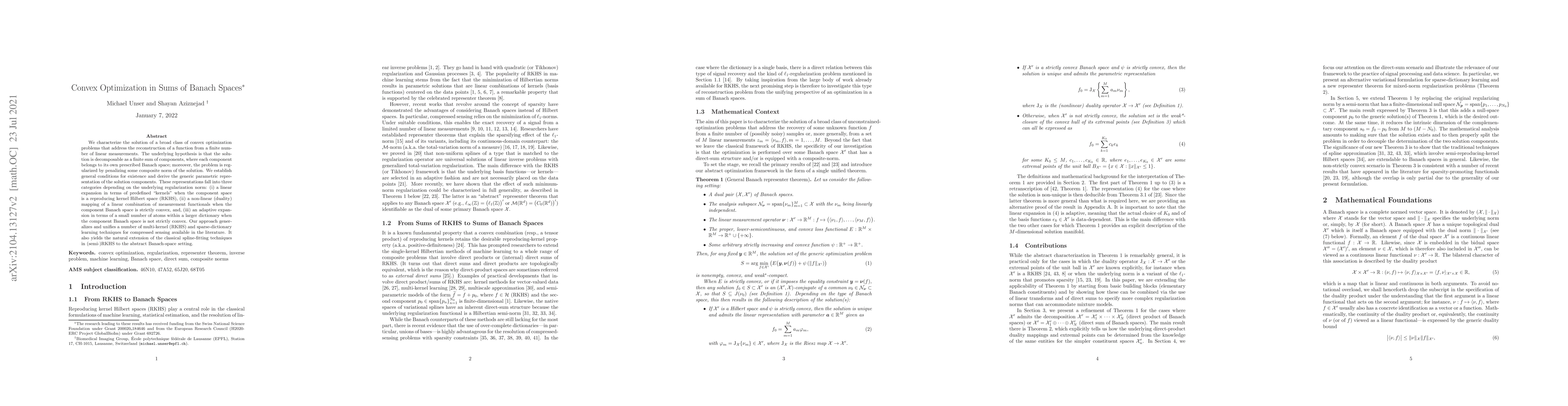 We characterize the solution of a broad class of convex optimization problems that address the reconstruction of a function from a finite number of linear measurements. The underlying hypothesis is that the solution is decomposable as a finite sum of components, where each component belongs to its own prescribed Banach space; moreover, the problem is regularized by penalizing some composite norm of the solution. We establish general conditions for existence and derive the generic parametric representation of the solution components. These representations fall into three categories depending on the underlying regularization norm: (i) a linear expansion in terms of predefined "kernels" when the component space is a reproducing kernel Hilbert space (RKHS), (ii) a non-linear (duality) mapping of a linear combination of measurement functionals when the component Banach space is strictly convex, and, (iii) an adaptive expansion in terms of a small number of atoms within a larger dictionary when the component Banach space is not strictly convex. Our approach generalizes and unifies a number of multi-kernel (RKHS) and sparse-dictionary learning techniques for compressed sensing available in the literature. It also yields the natural extension of the classical spline-fitting techniques in (semi-)RKHS to the abstract Banach-space setting.