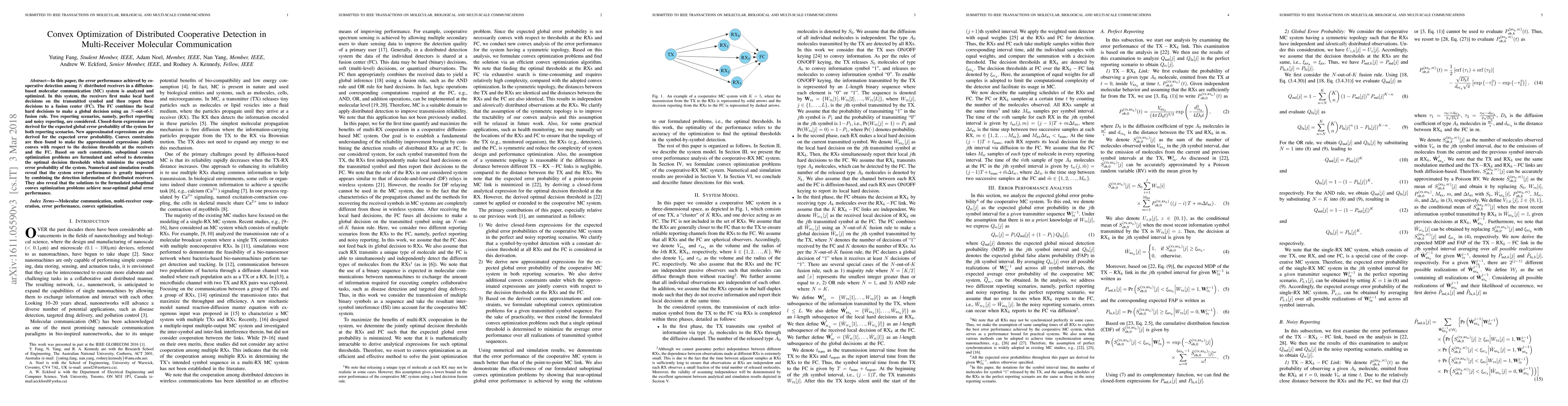 This paper optimizes cooperative detection in a multi-receiver molecular communication system by analyzing error performance and deriving convex optimization problems to minimize global error probability. Numerical results show significant performance improvement through distributed receiver information fusion.