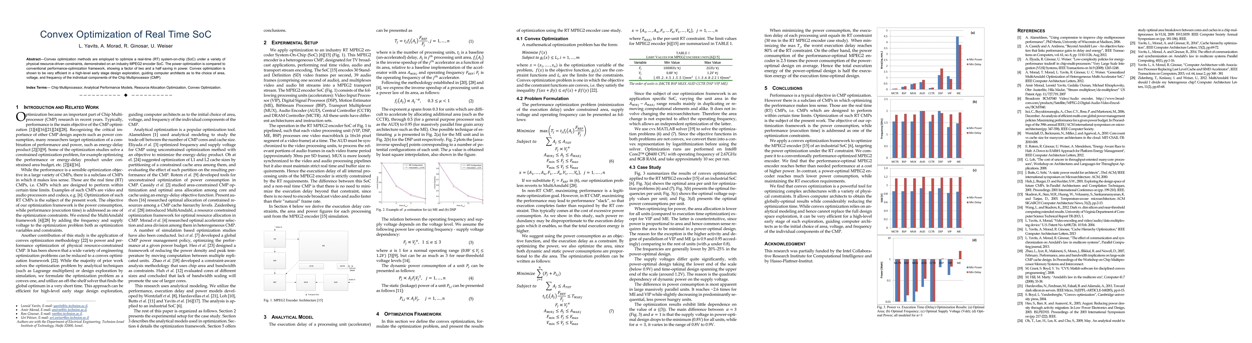Convex optimization methods are employed to optimize a real-time (RT) system-on-chip (SoC) under a variety of physical resource-driven constraints, demonstrated on an industry MPEG2 encoder SoC. The power optimization is compared to conventional performance-optimization framework, showing a factor of two and a half saving in power. Convex optimization is shown to be very efficient in a high-level early stage design exploration, guiding computer architects as to the choice of area, voltage, and frequency of the individual components of the Chip Multiprocessor (CMP).