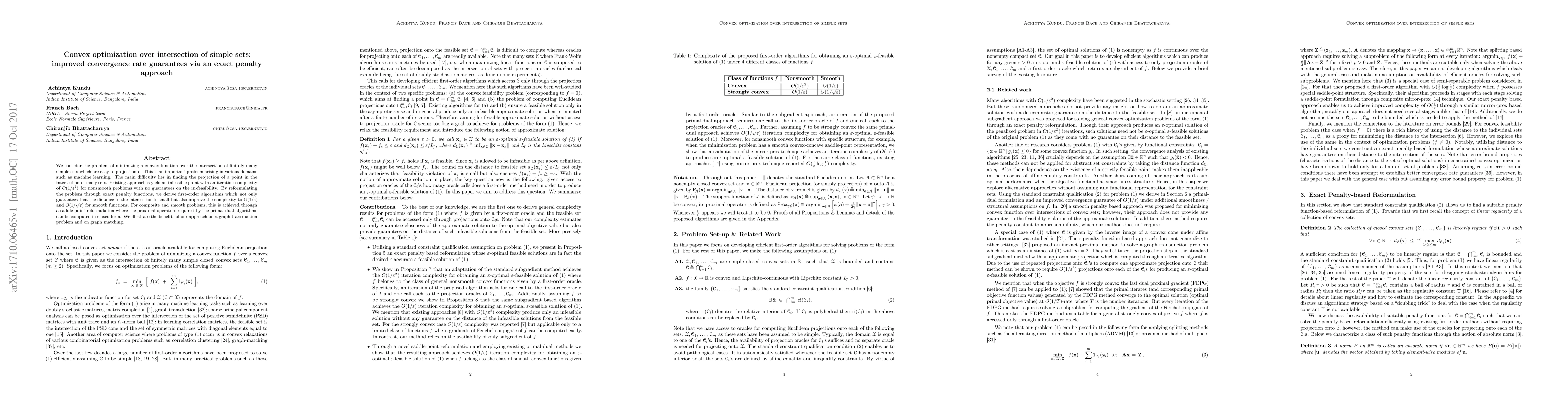 We consider the problem of minimizing a convex function over the intersection of finitely many simple sets which are easy to project onto. This is an important problem arising in various domains such as machine learning. The main difficulty lies in finding the projection of a point in the intersection of many sets. Existing approaches yield an infeasible point with an iteration-complexity of $O(1/\varepsilon^2)$ for nonsmooth problems with no guarantees on the in-feasibility. By reformulating the problem through exact penalty functions, we derive first-order algorithms which not only guarantees that the distance to the intersection is small but also improve the complexity to $O(1/\varepsilon)$ and $O(1/\sqrt{\varepsilon})$ for smooth functions. For composite and smooth problems, this is achieved through a saddle-point reformulation where the proximal operators required by the primal-dual algorithms can be computed in closed form. We illustrate the benefits of our approach on a graph transduction problem and on graph matching.