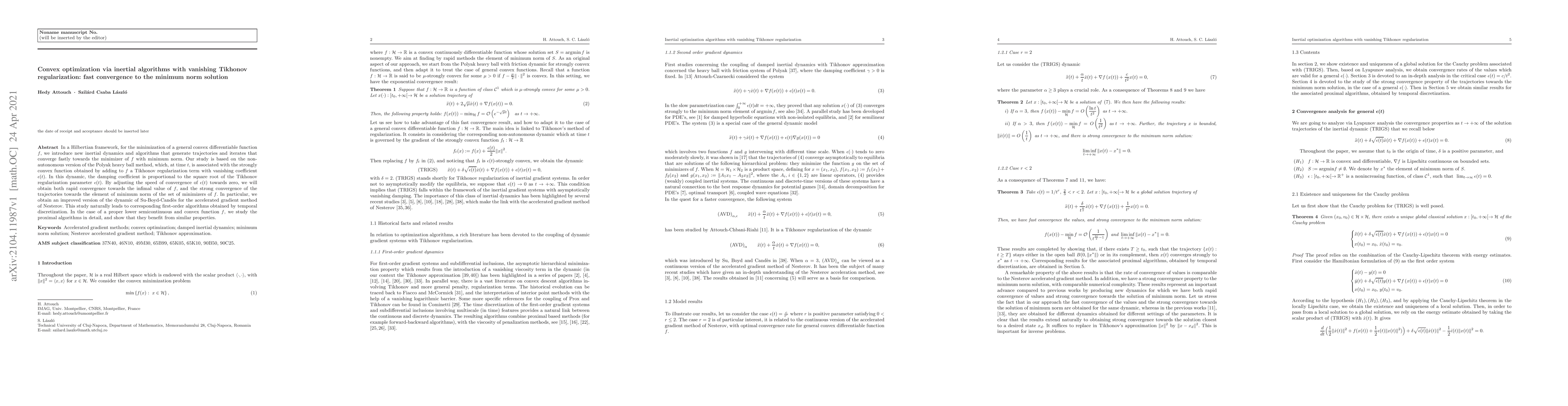 This paper introduces a new inertial optimization algorithm in a Hilbertian framework that converges rapidly to the minimum norm solution of a convex differentiable function. By incorporating a vanishing Tikhonov regularization term, the method achieves both fast convergence to the infimal value and strong convergence to the minimum norm minimizer.